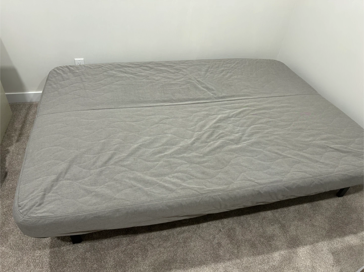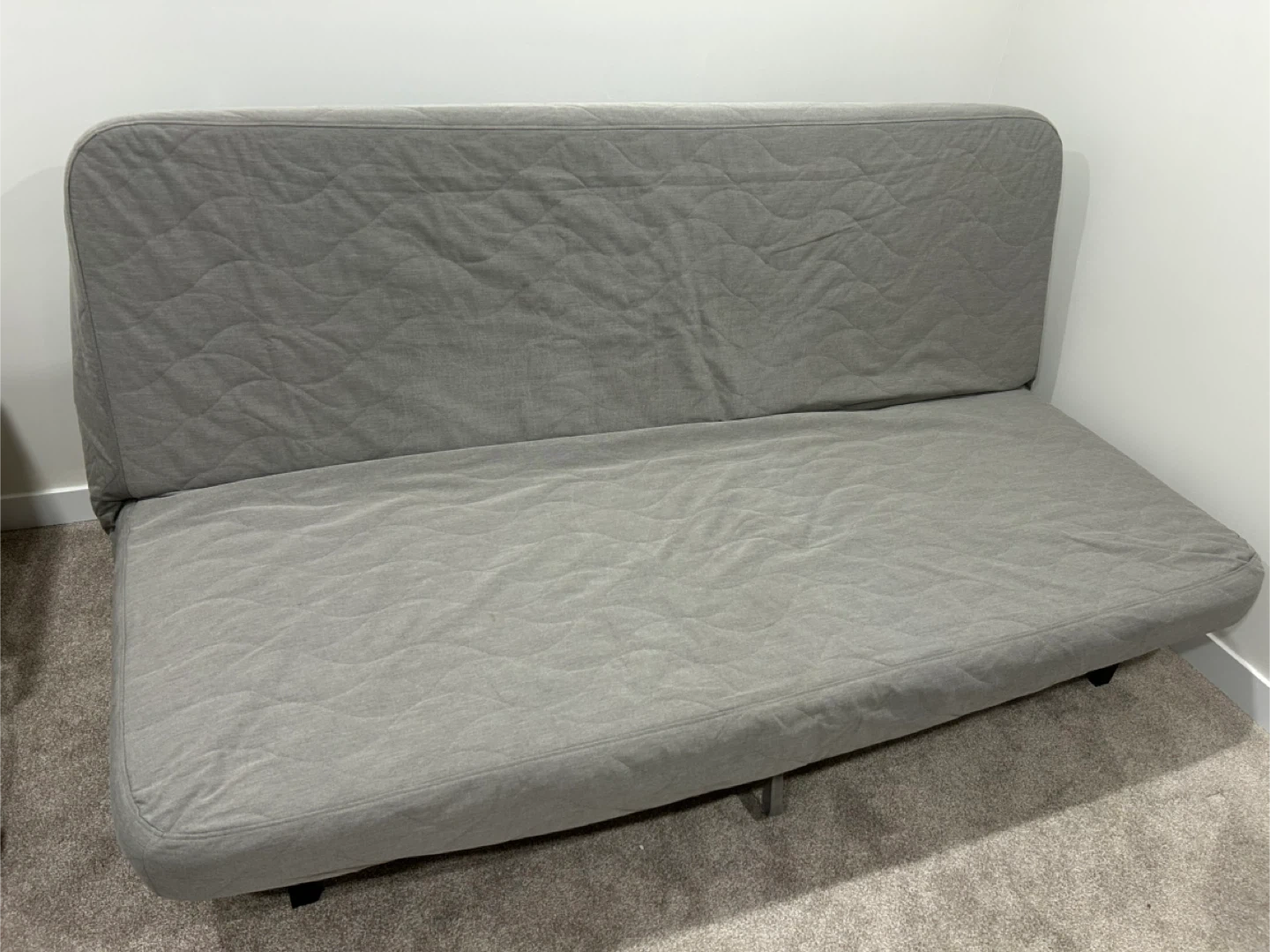 Selling a grey IKEA futon sofa bed. It's in good condition and perfect for a small space or guest room. It easily converts from a sofa to a bed, making it a versatile piece of furniture for any home. Removable, washable grey cover. Delivery available for extra.