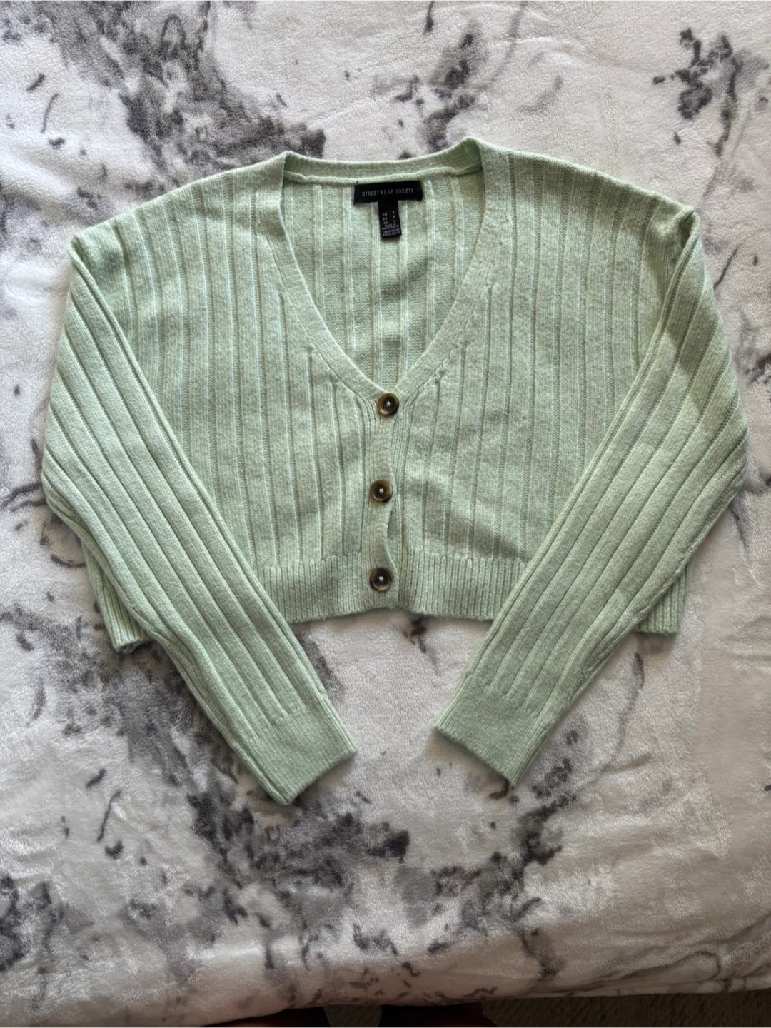 Selling a cute Streetwear Society cardigan in size small! It's a light mint green colour and has a ribbed texture. Cropped in length.
