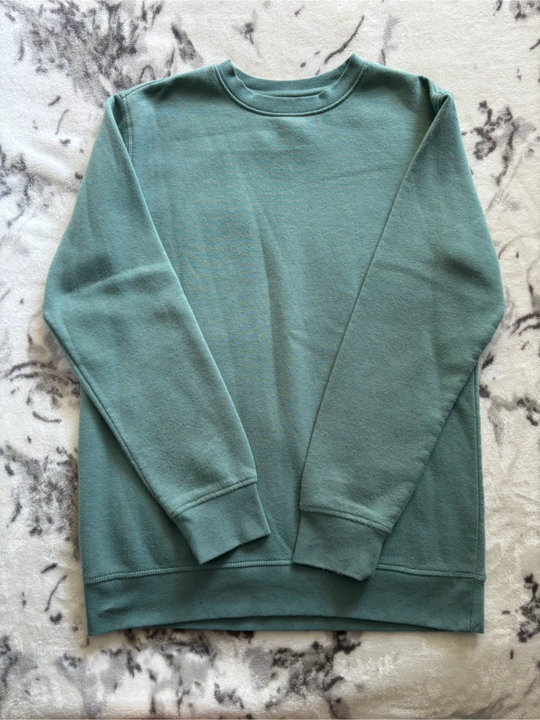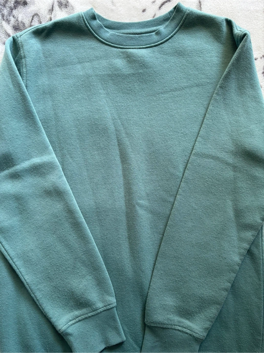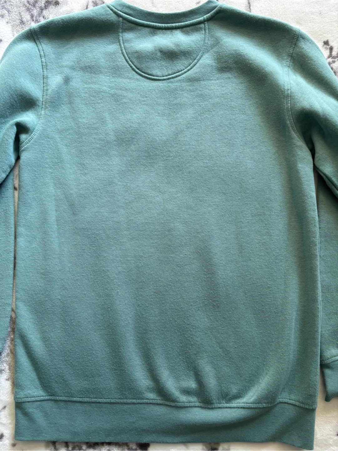 Cozy Athletic Works crewneck in a nice green colour! It's a men’s size small and made of 37% cotton, 32% recycled polyester, and 31% polyester