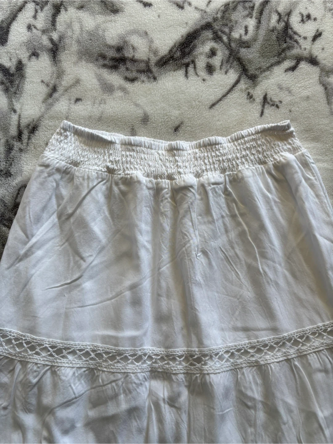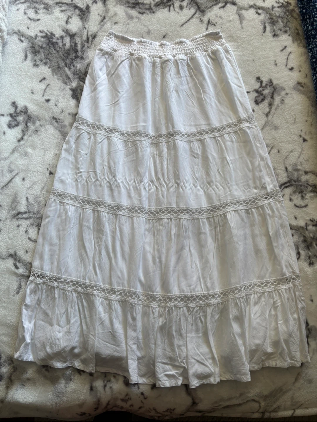 Selling a cute white Ardene skirt in size small! It has a tiered design and an elastic waistband for a comfy fit. The shell is 100% Viscose and the lining is 100% Polyester. Ankle length.