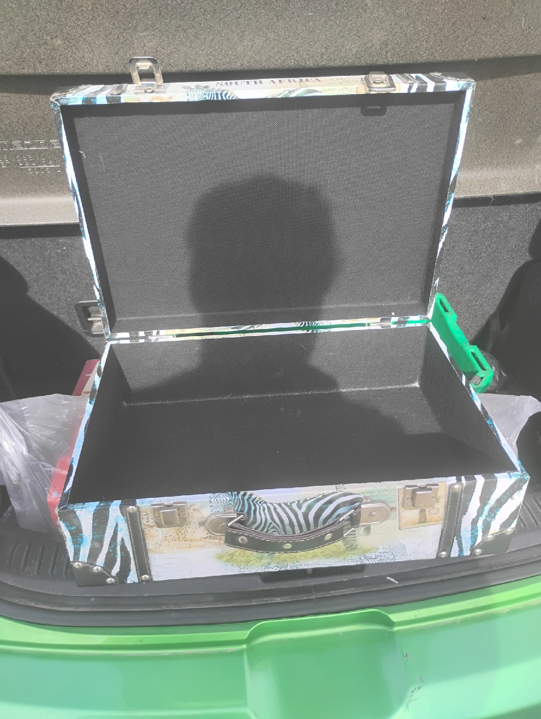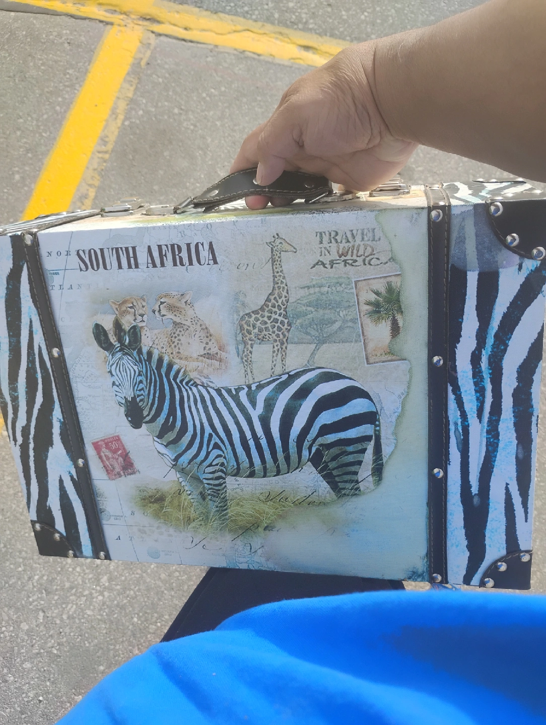 Decorative suitcase with a fun zebra print! It features scenes of South Africa and wildlife like giraffes and cheetahs. Perfect for adding a touch of safari style to your home decor