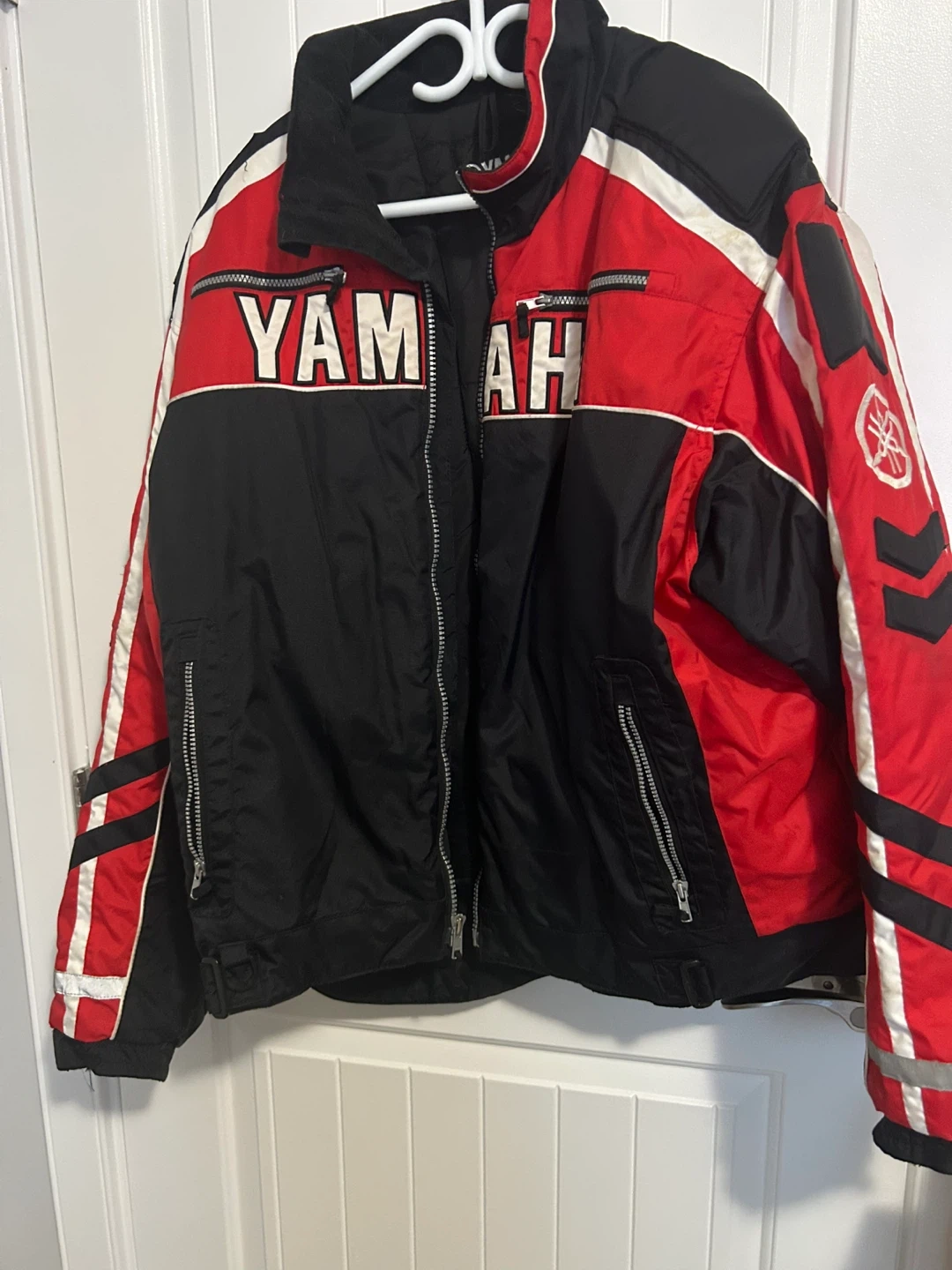 Selling a Yamaha Snowmobile riding jacket in great condition! The jacket features a striking combination of red, black, and white. It has a full zipper, multiple pockets, and the Yamaha logo prominently displayed. Perfect for any Yamaha enthusiast!