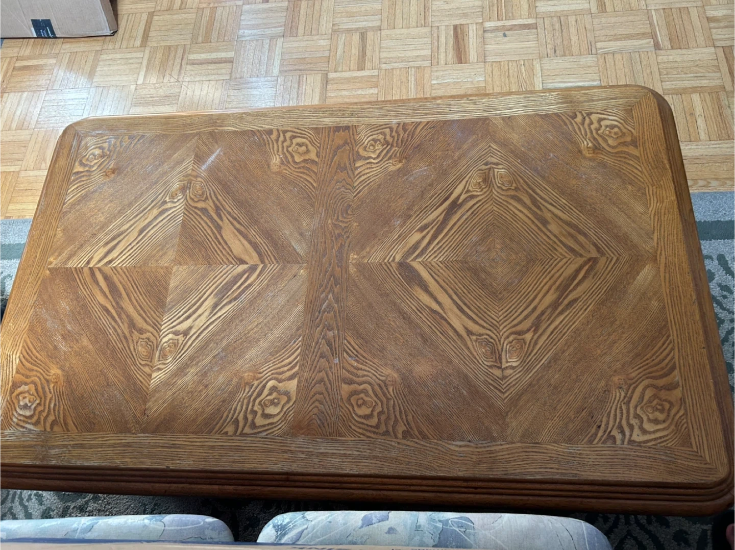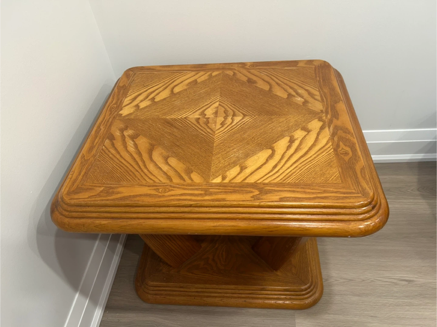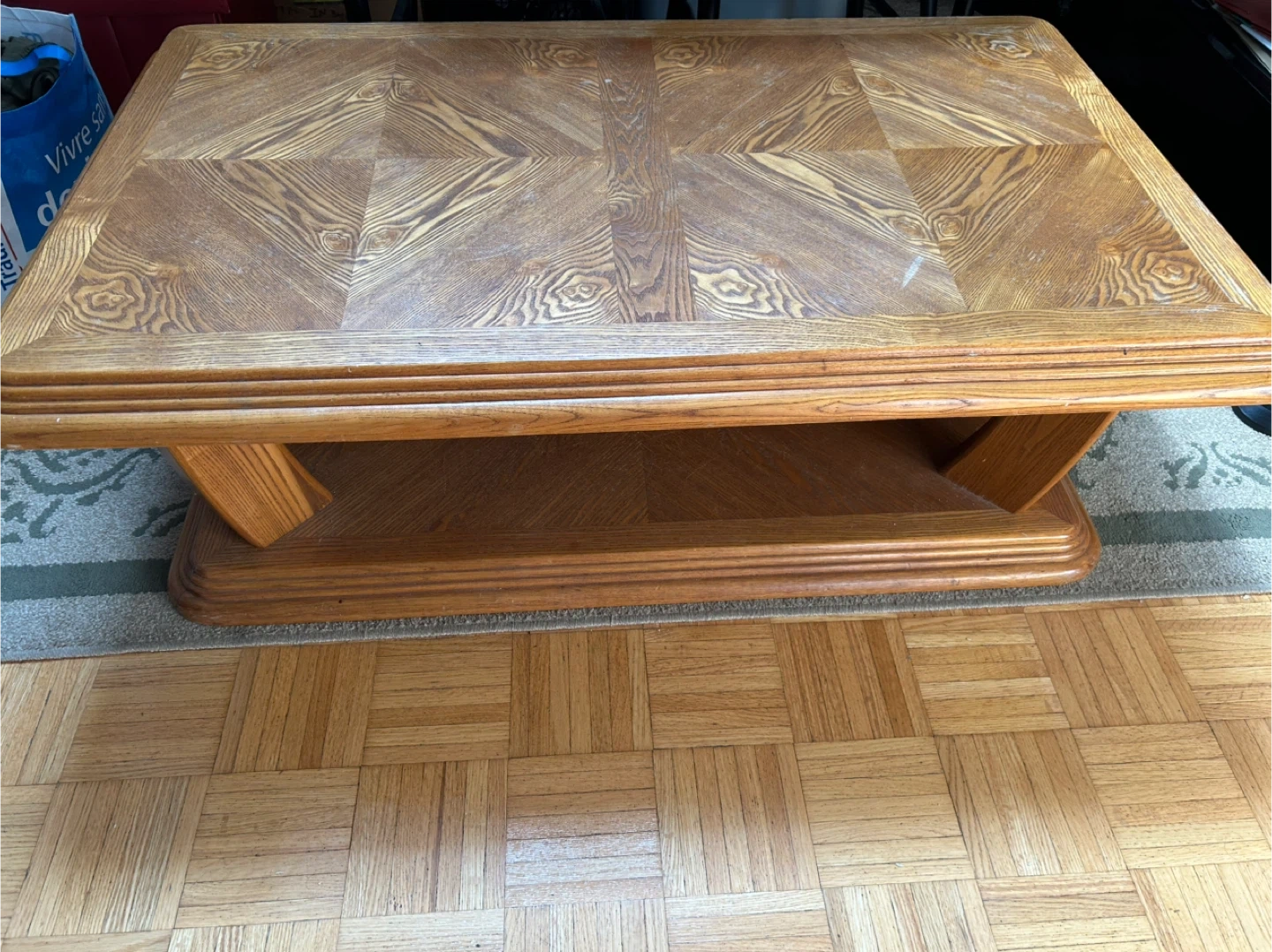 2 pc wooden coffee table set. They have a beautiful wood grain pattern on top and a sturdy base. The tables are in good condition and would be a great addition to any living room! Dimensions 49in L x 30in W and 27in L x 24in W.