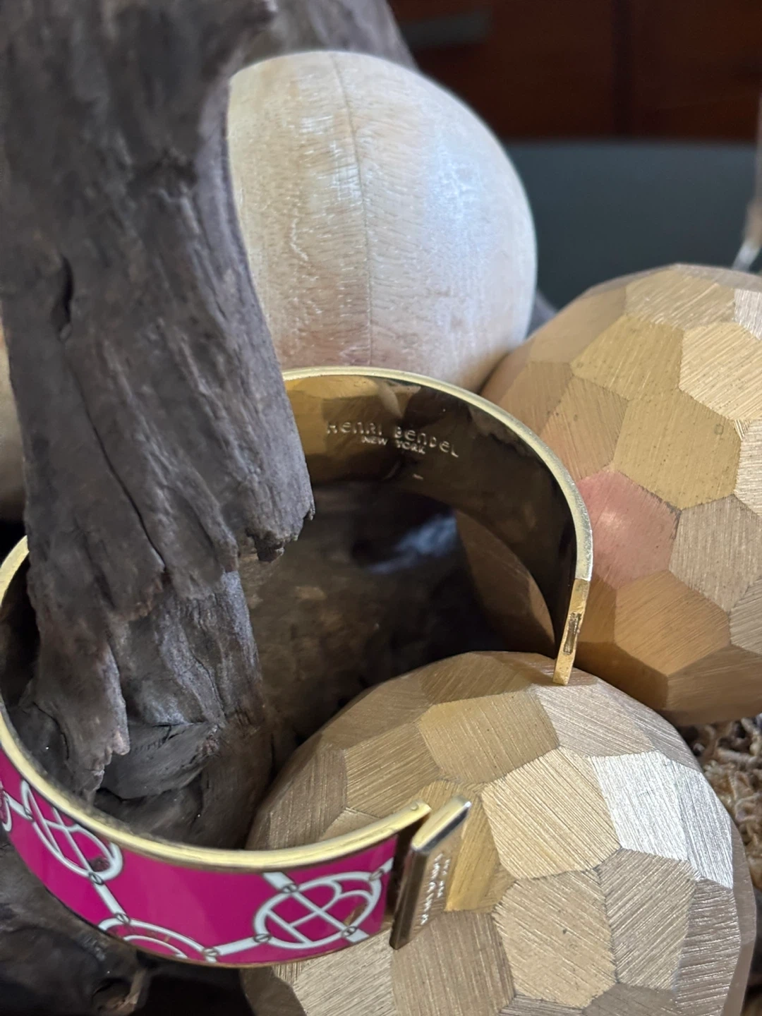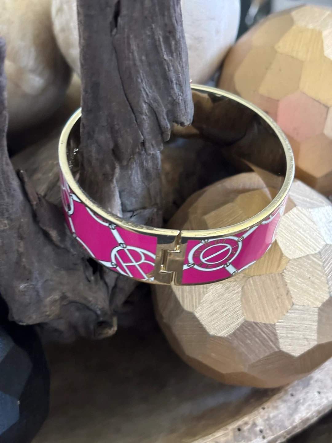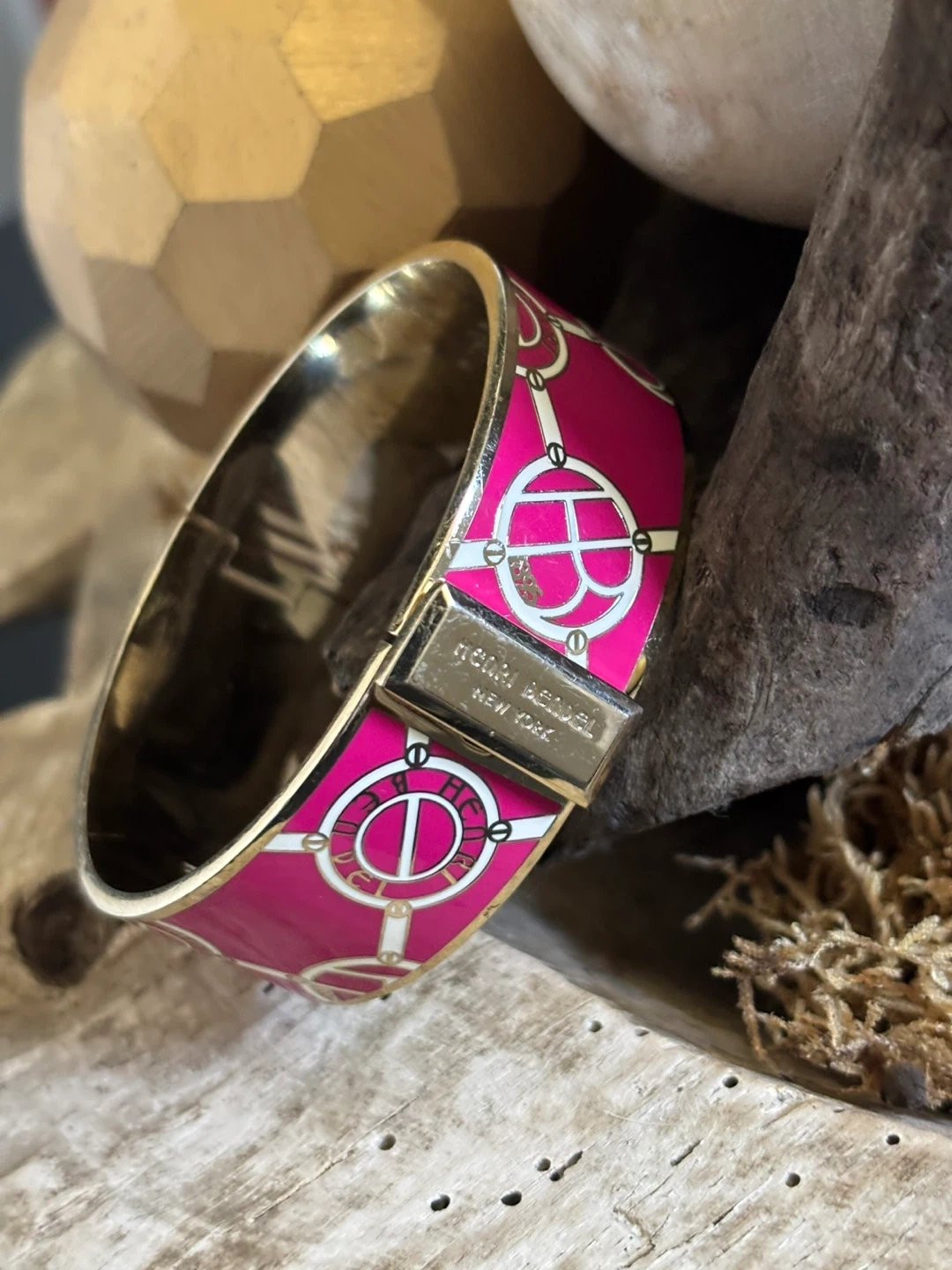 “Pretty in pink” Henri Bendel signature logo hinged bangle bracelet in pink|gold.