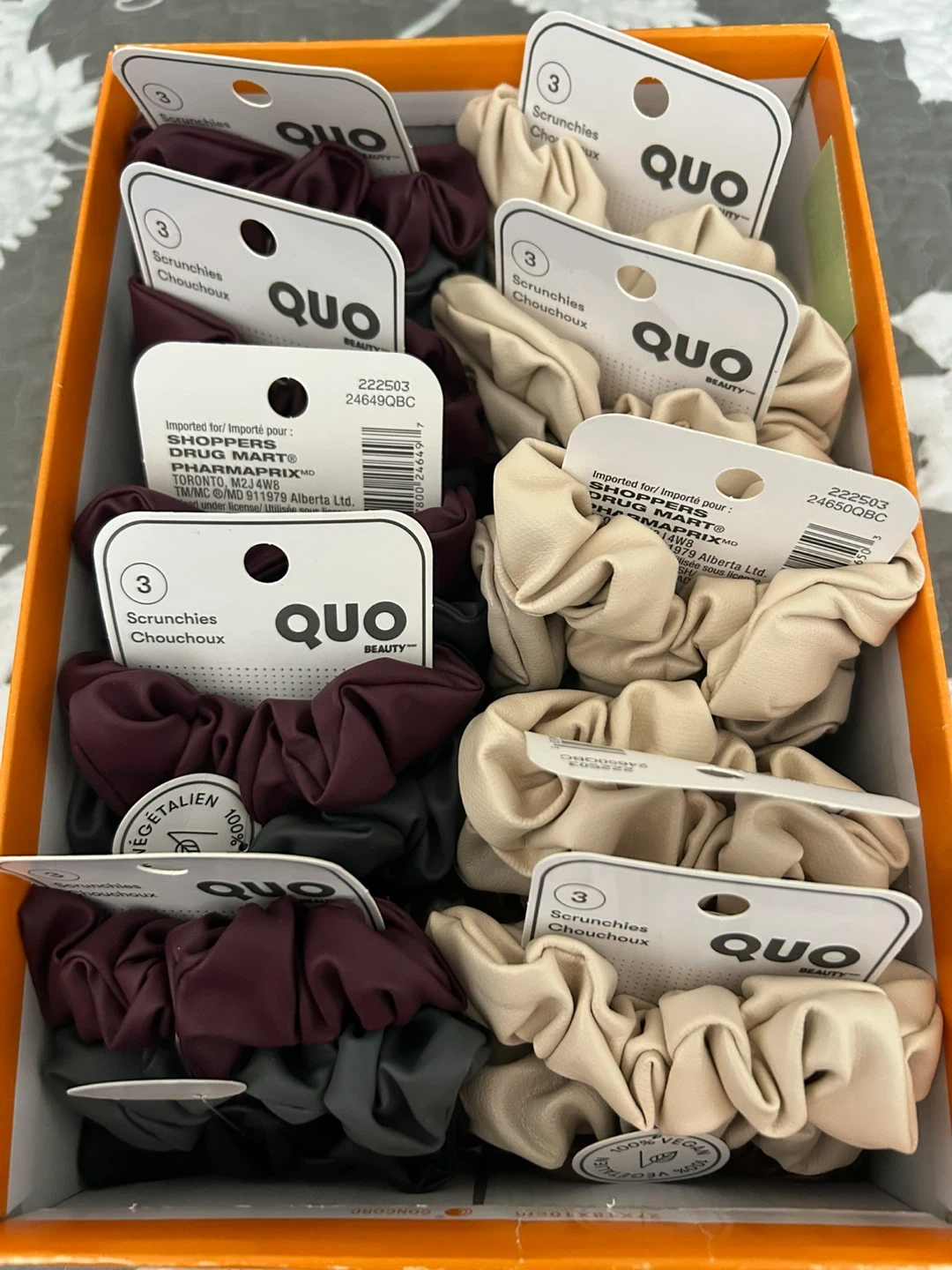 Selling a pack of 3 QUO Beauty scrunchies! These are brand new and come in a variety of colours. Perfect for keeping your hair up in style. They are also 100% vegan! Leather, Per each set of 3.