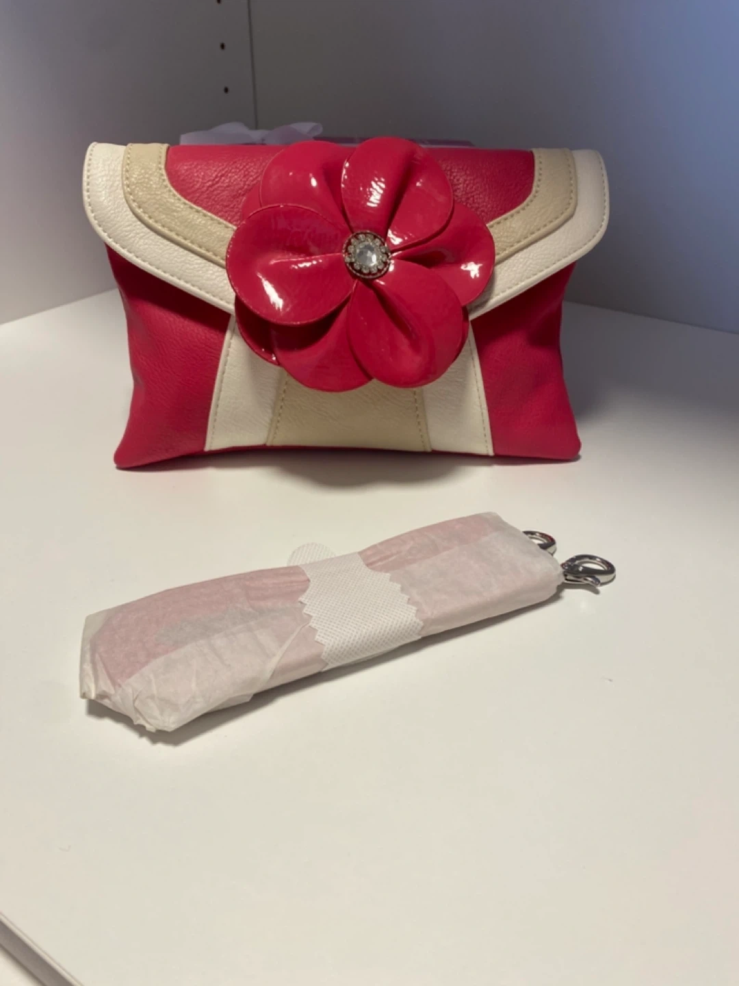 New , never used -Gorgeous clutch in a lovely pink colour with a rhinestone flower design!