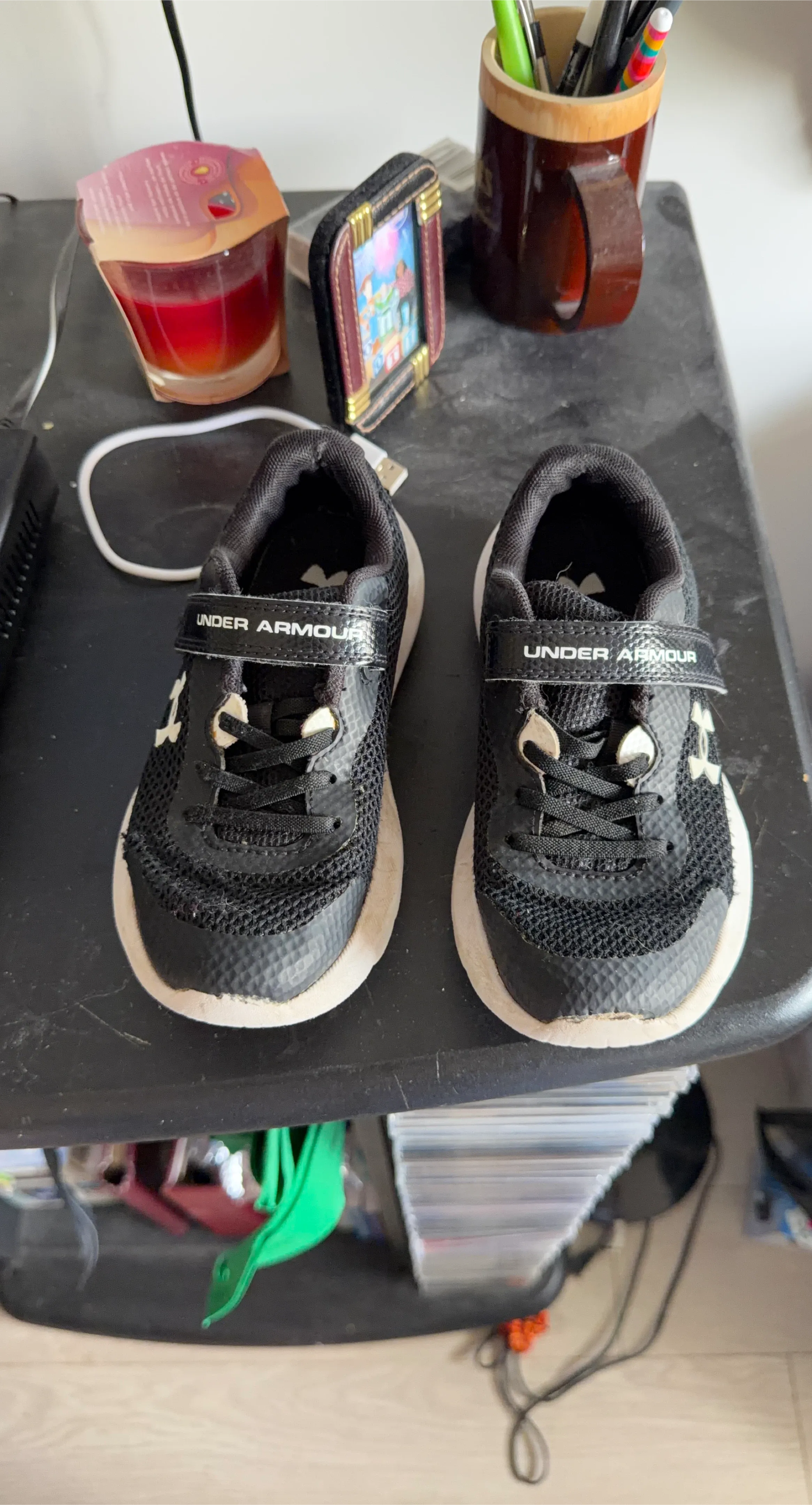 Selling a pair of Under Armour kids' shoes. They're black with white soles and have a velcro strap. They show some signs of wear on the front, but still have lots of life left!