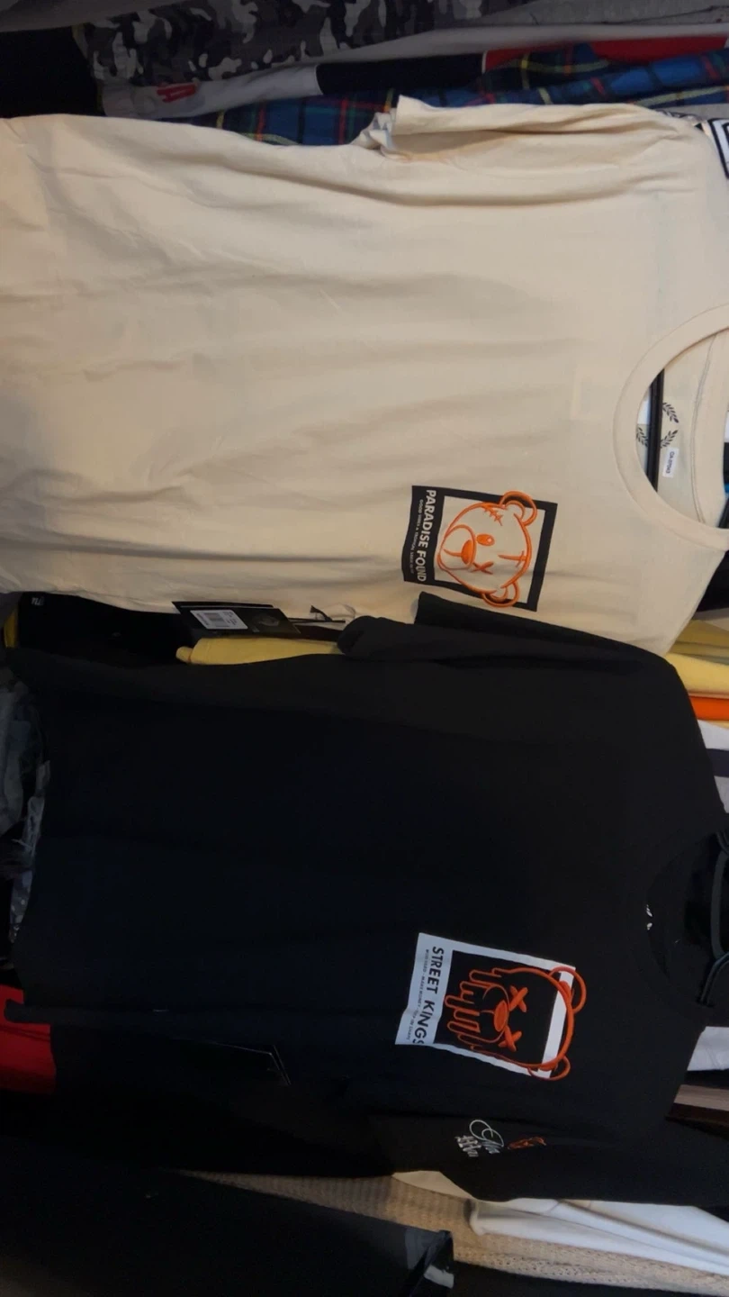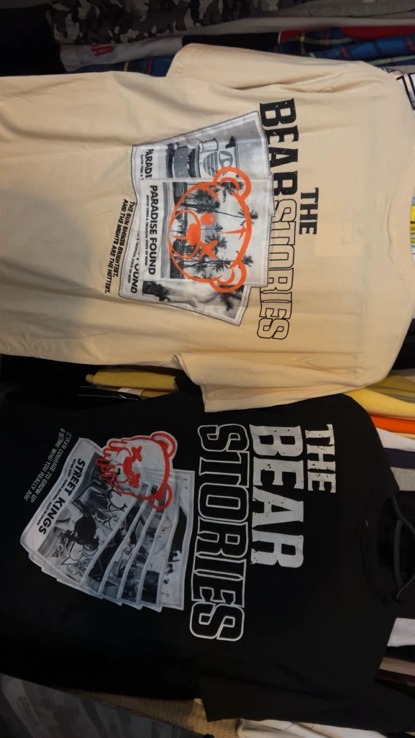 Two cool graphic tees from The Bear Stories! One is a cream colour with a 'Paradise Found' design, and the other is black with a 'Street Kings' design. Both have the brand name boldly displayed. They're in great shape and ready for a new home