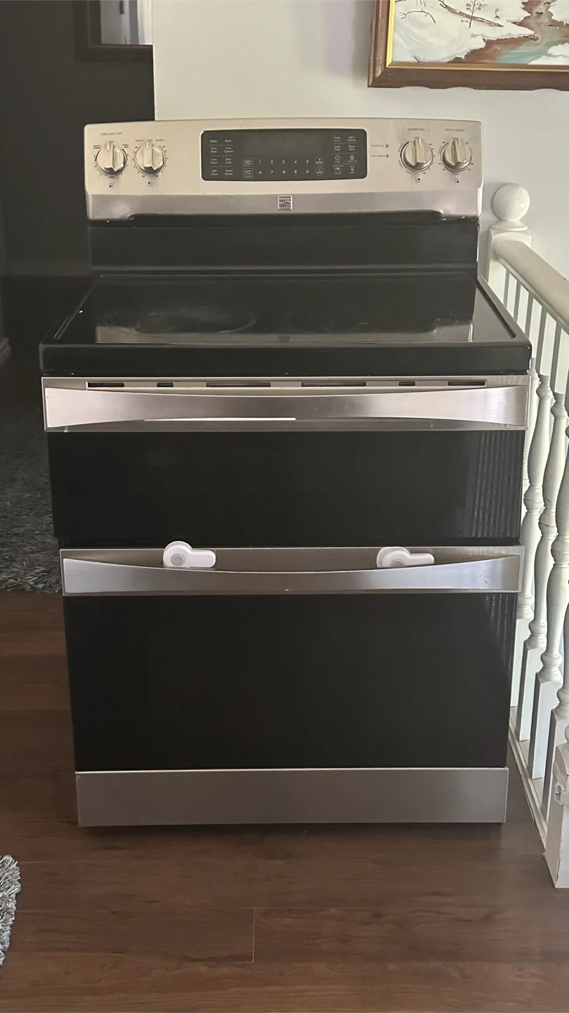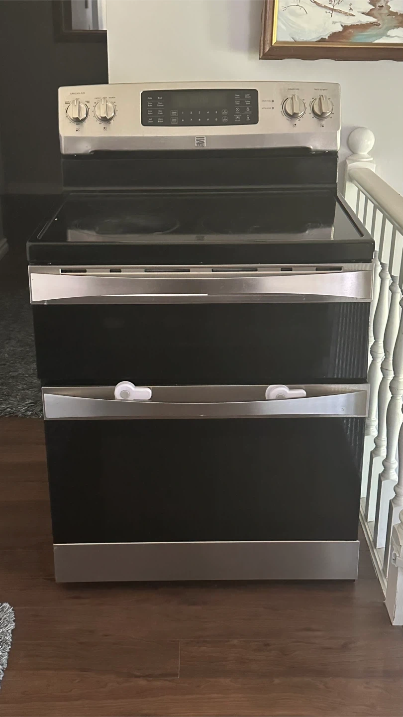 Kenmore double oven range in great condition! This range features a sleek black and stainless steel design that will look great in any kitchen. It has two ovens, so you can cook multiple dishes at once. Perfect for holiday dinners or baking enthusiasts Note :The oven sometimes turns off just need to be fixed