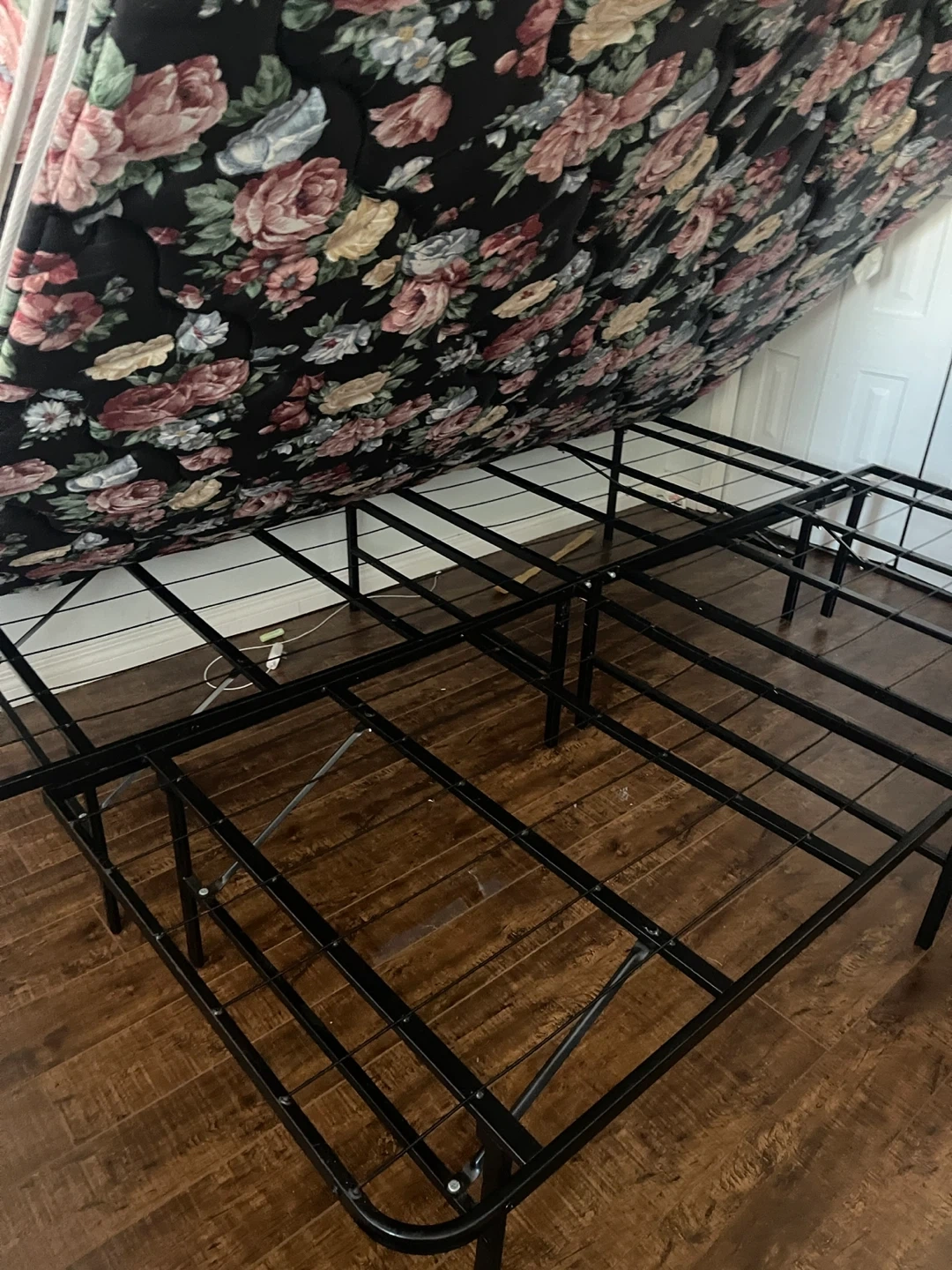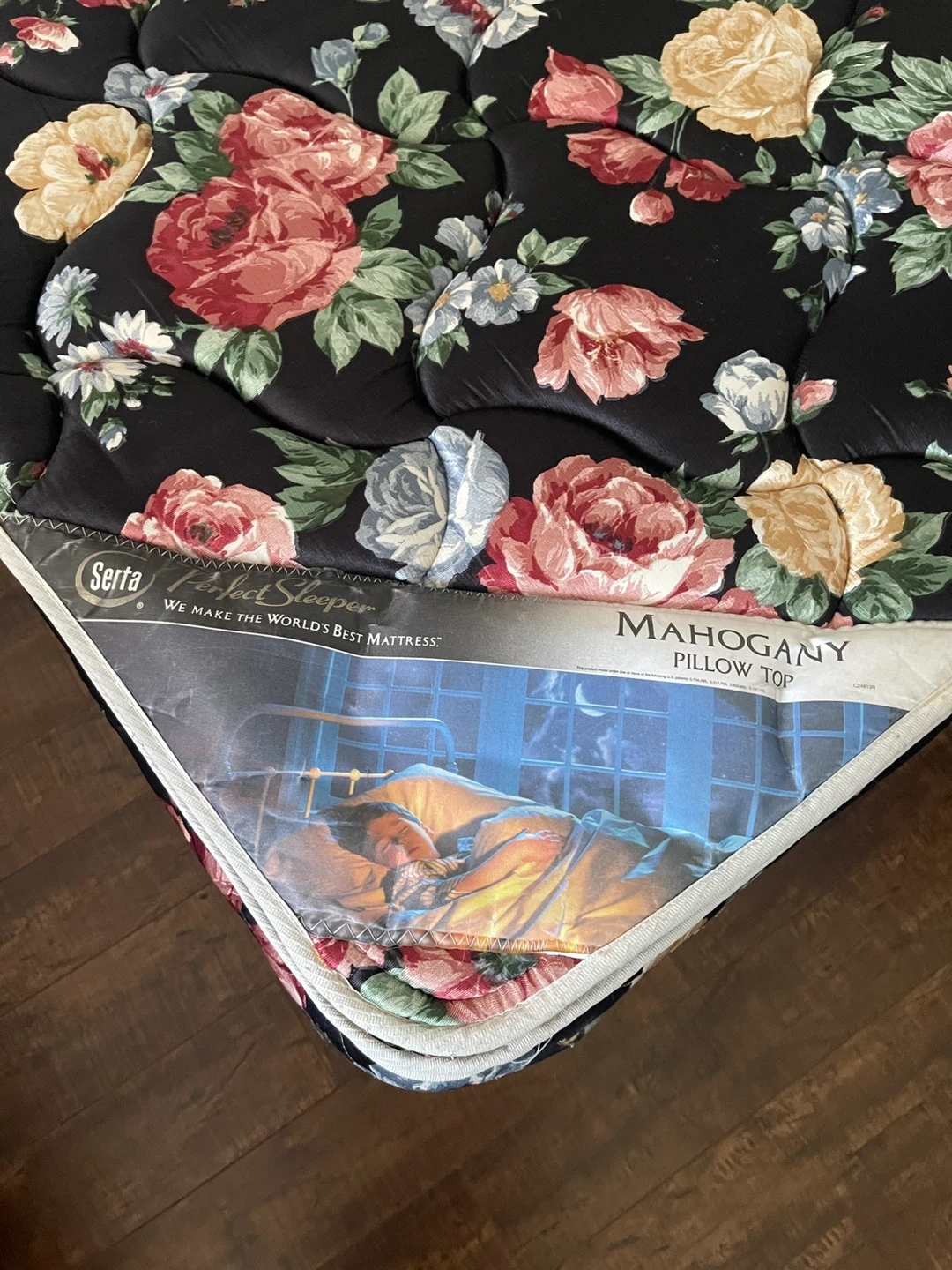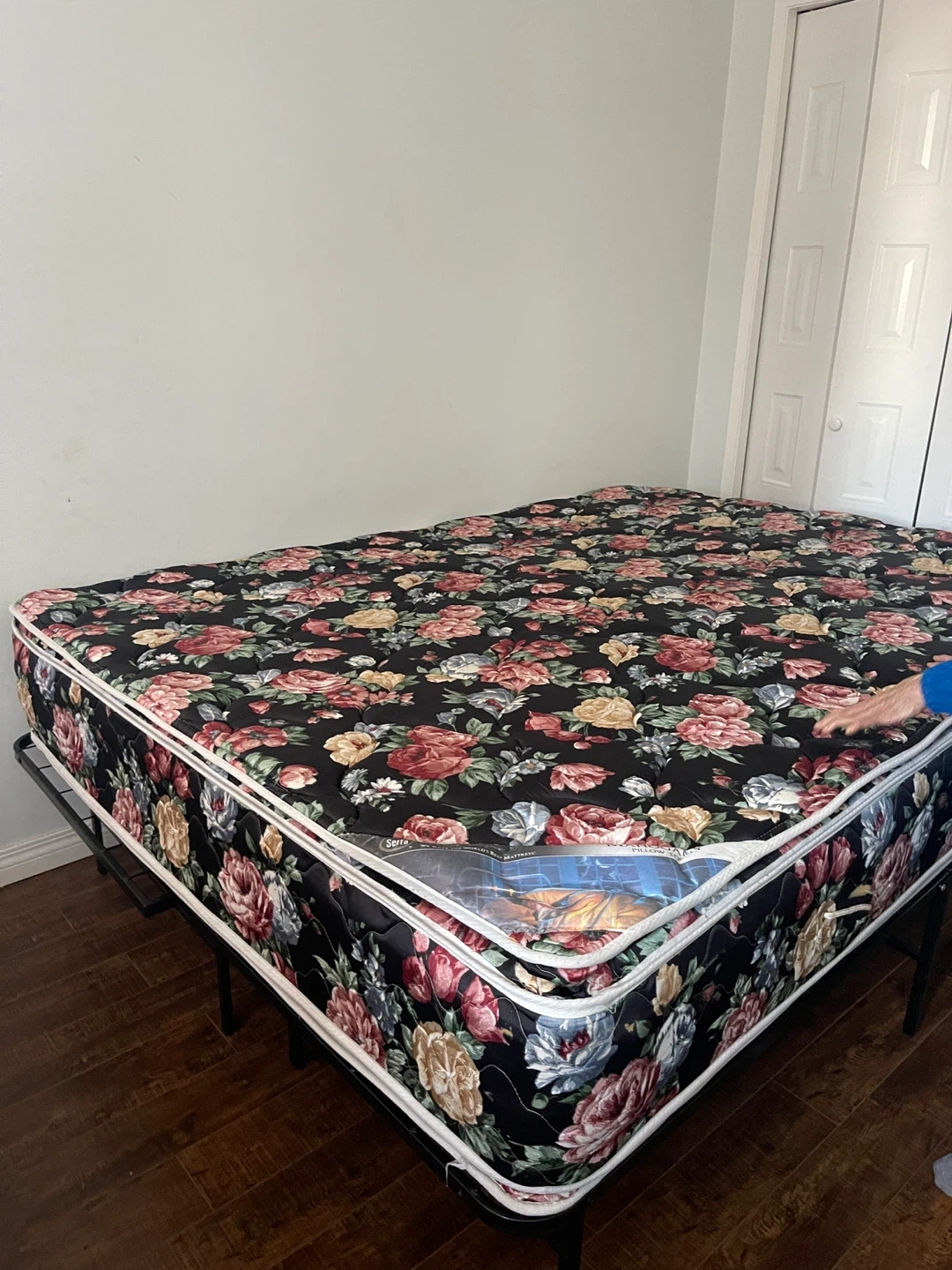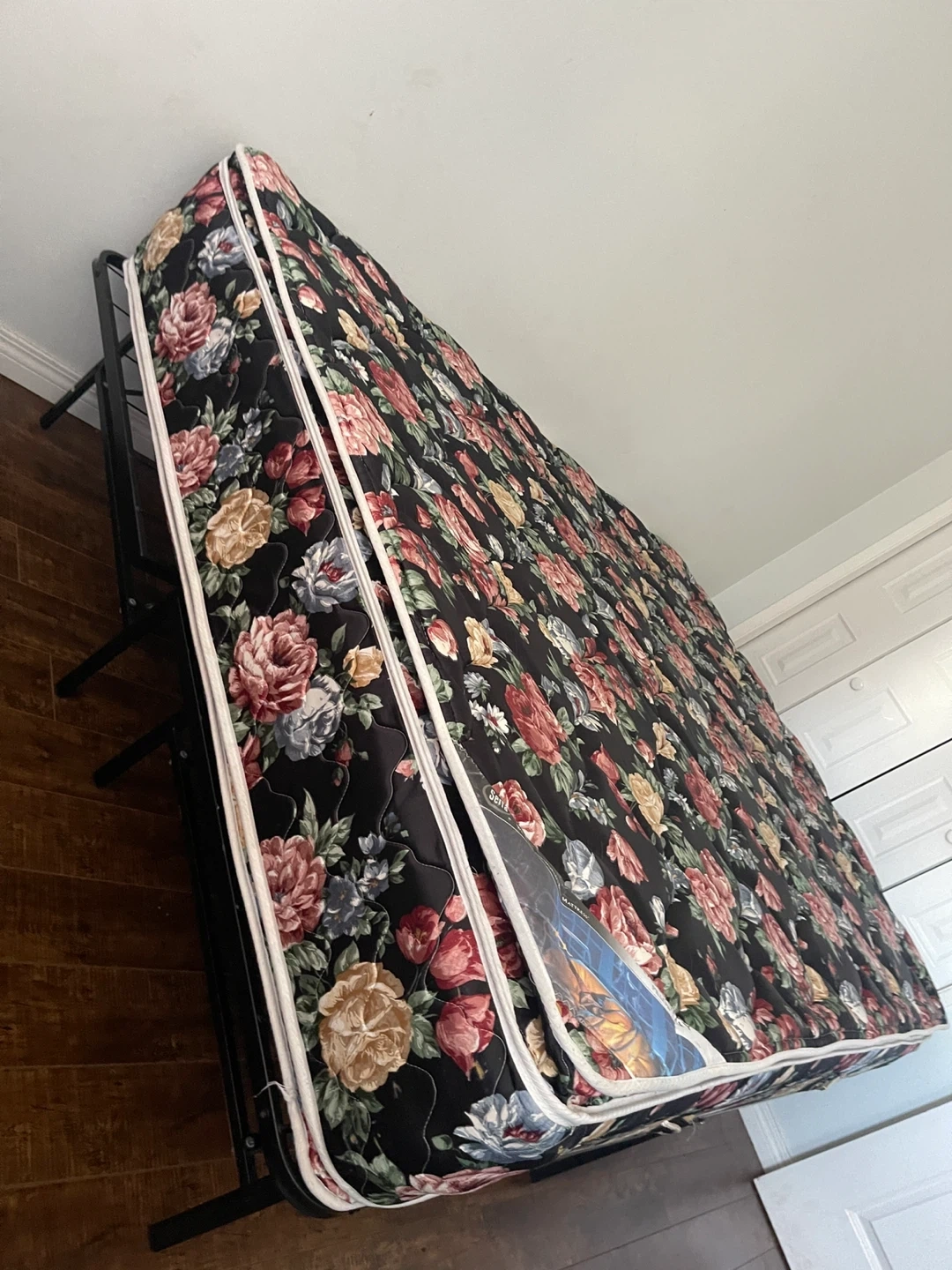 Queen bed frame with Mahogany Mattress. It's in good condition and ready for a new home.