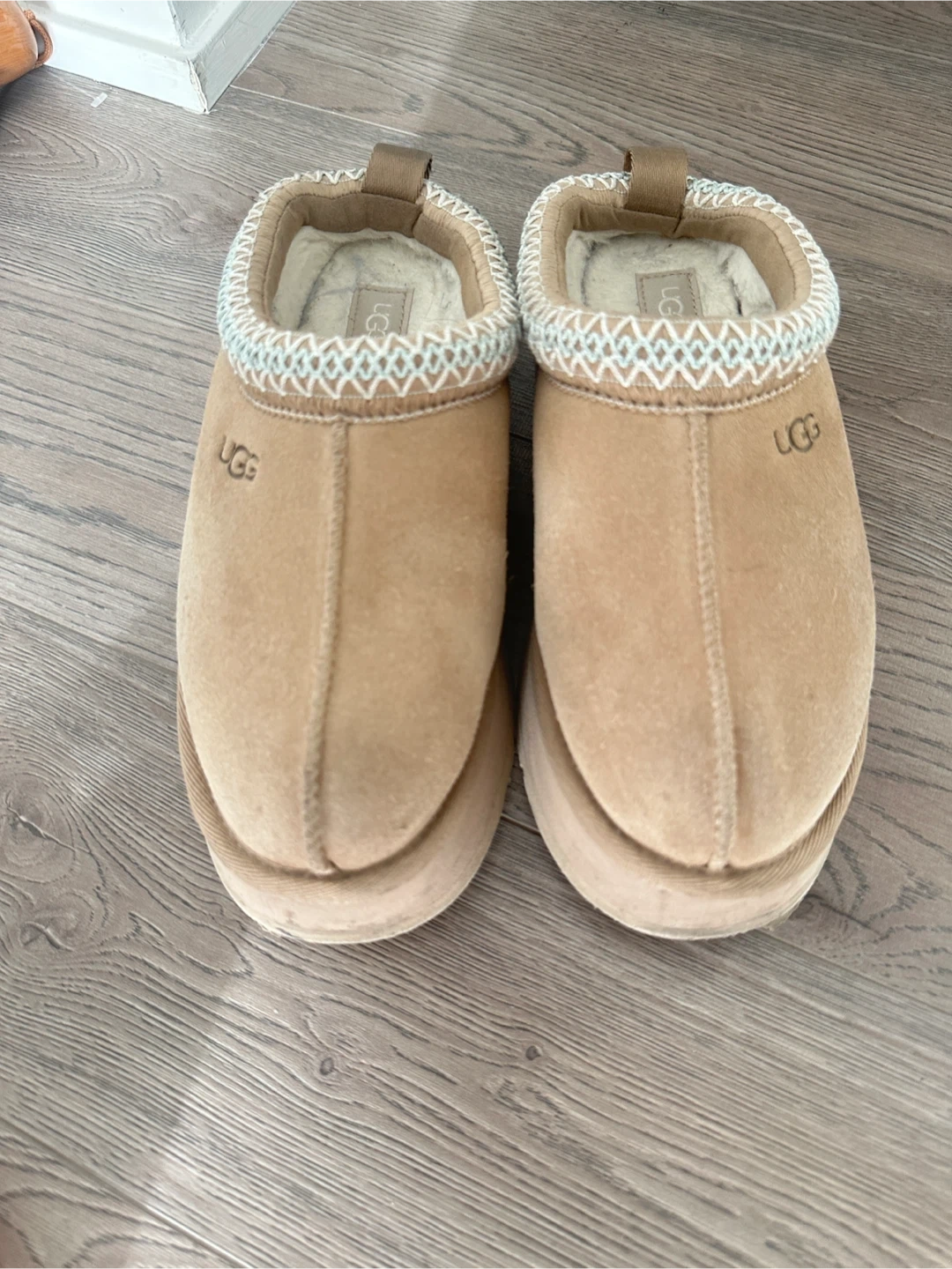 26Selling a pair of UGG Women's Tasman Platform slippers in a size 6. It has some stains, but overall it’s in good shape and condition to wear. I priced it low considering the stains, so if you’re looking for something comfortable to wear, this is for you.