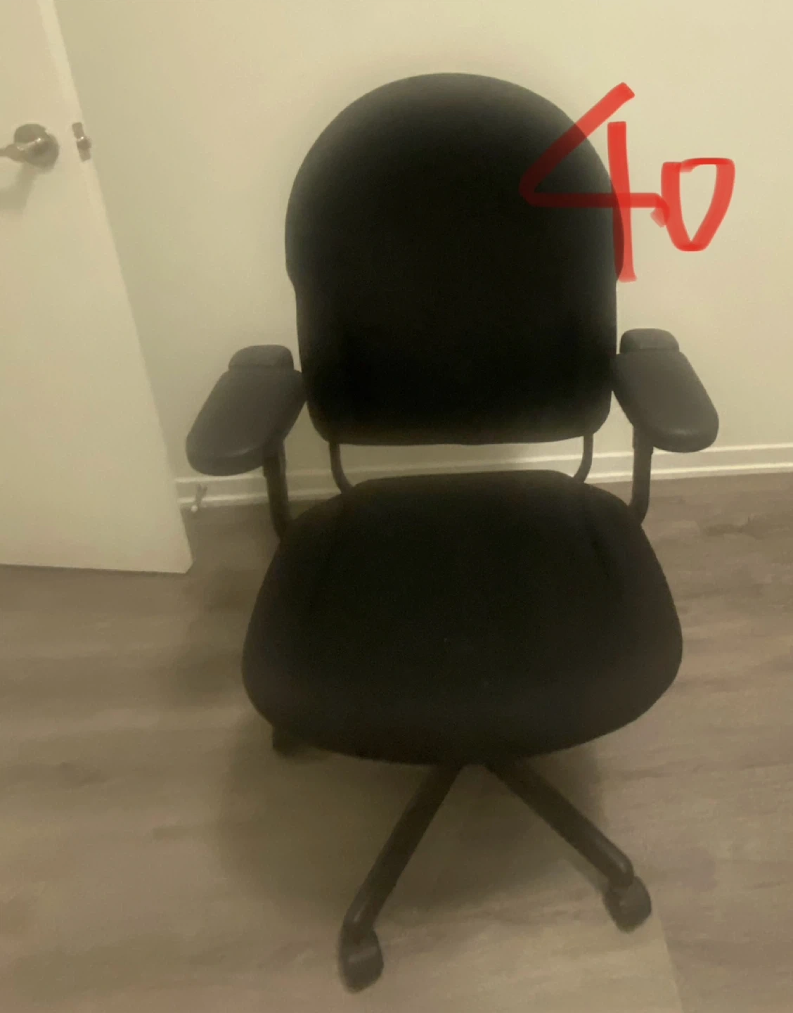 Selling a used black office chair in good condition. It's perfect for a home office or study space. It features a comfortable seat and backrest, with adjustable armrests for added support