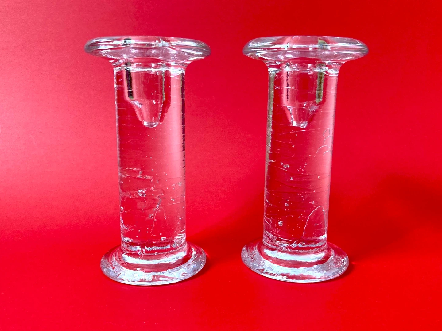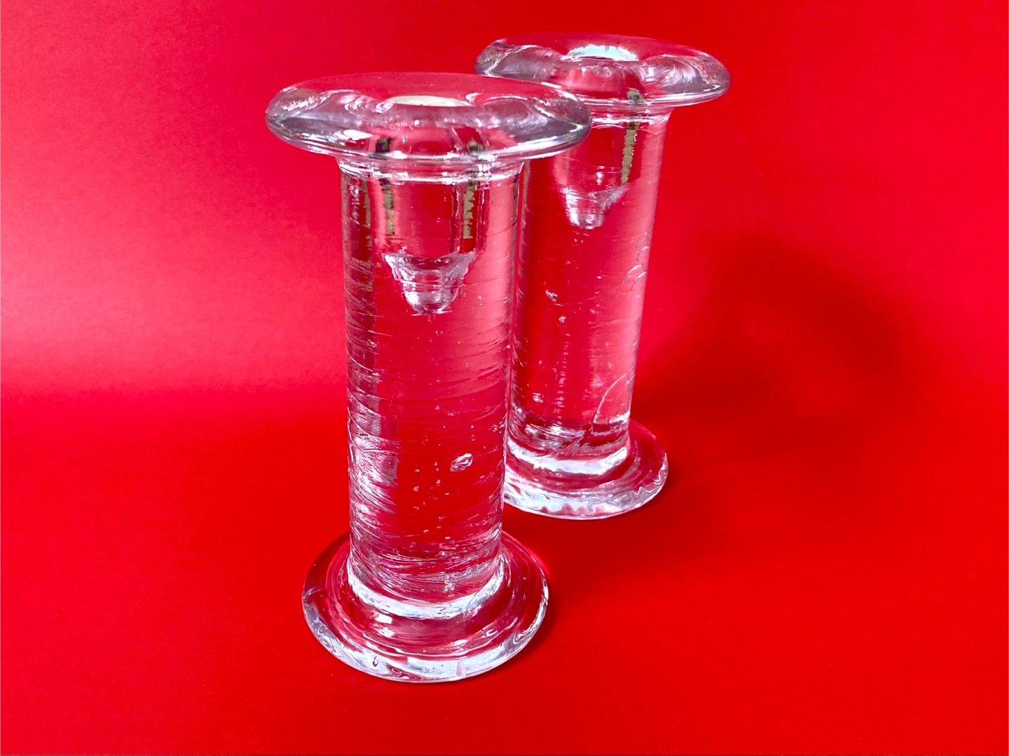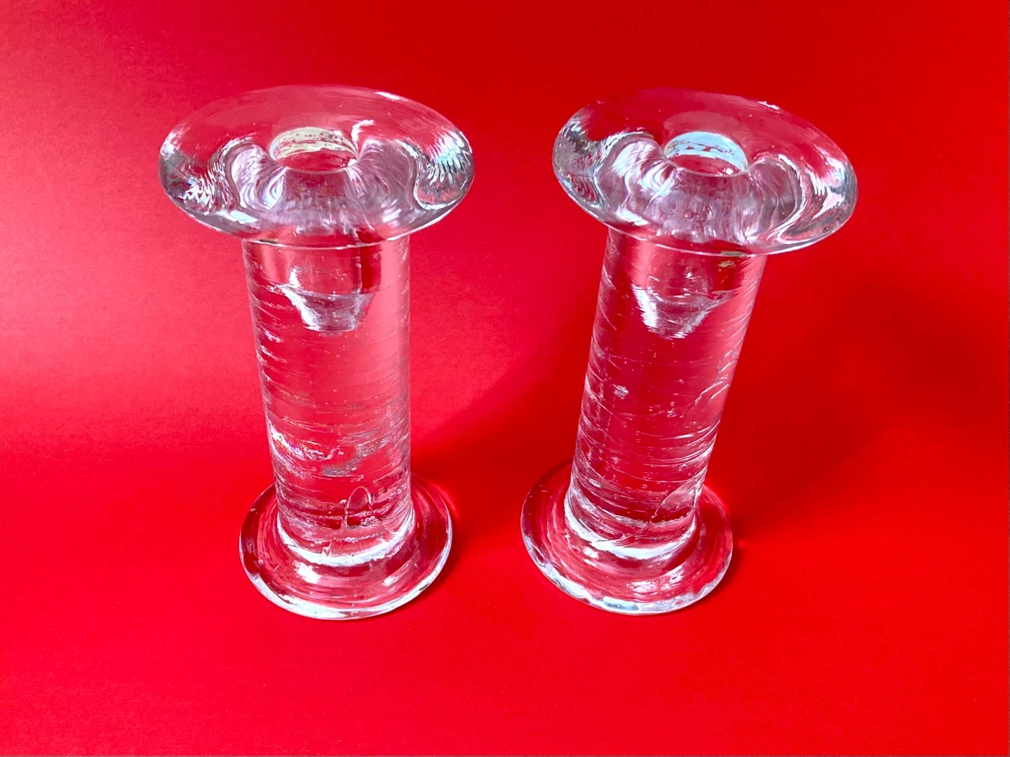 Very eye catching vintage art glass candleholders, very similar to Kosta Boda style, featuring a design resembling melted glass with bubbles. Substantial, large, and solid. Very well made. They would look great as holiday decor. - likely from the 1970s - 8 1/2β tall - 3 1/4β diameter at the top and bottom rim - perfect condition, no chips or cracks Pick up in the Ossington and Davenport area. Check my other listings for more vintage decor.π