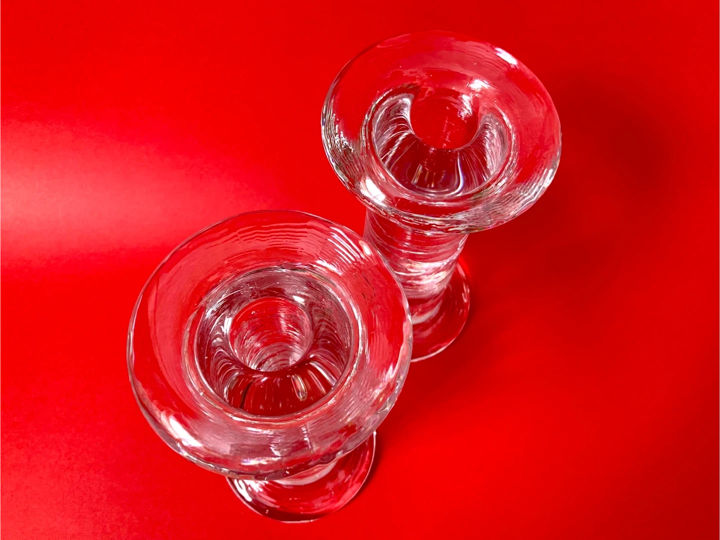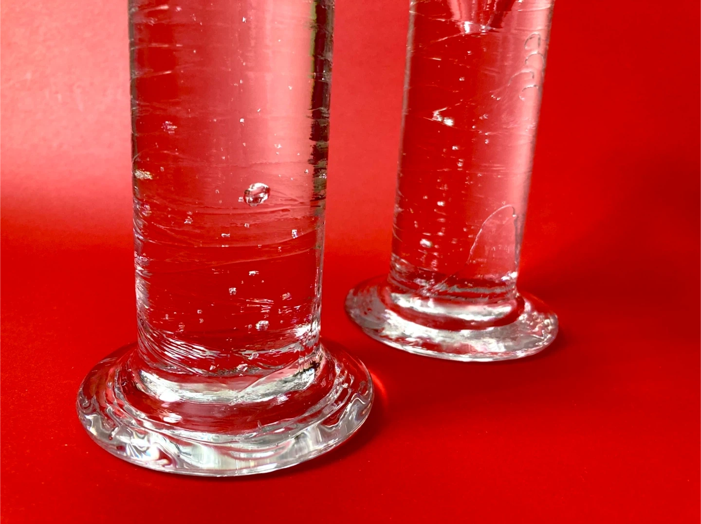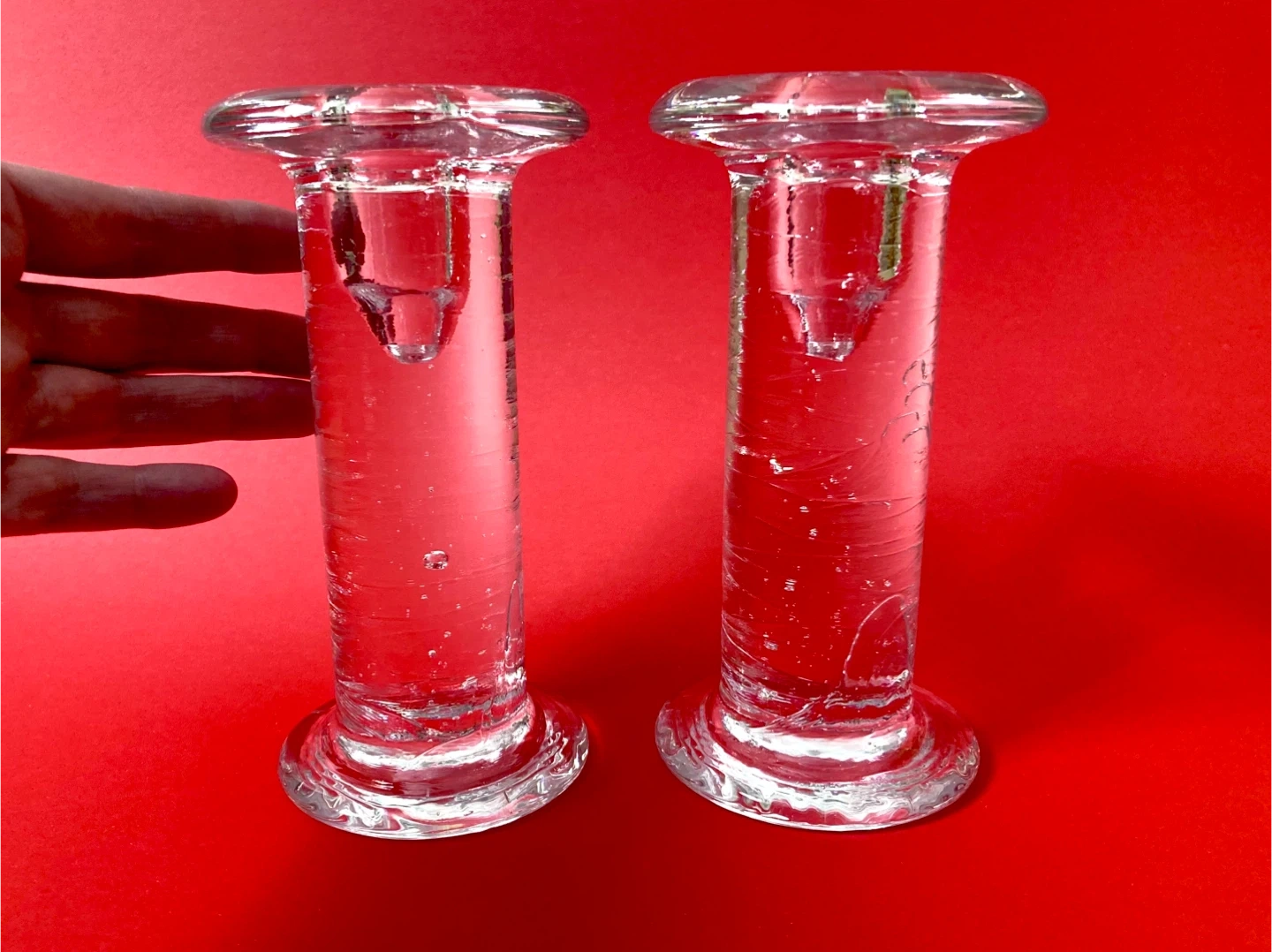 Very eye catching vintage art glass candleholders, very similar to Kosta Boda style, featuring a design resembling melted glass with bubbles. Substantial, large, and solid. Very well made. They would look great as holiday decor. - likely from the 1970s - 8 1/2β tall - 3 1/4β diameter at the top and bottom rim - perfect condition, no chips or cracks Pick up in the Ossington and Davenport area. Check my other listings for more vintage decor.π