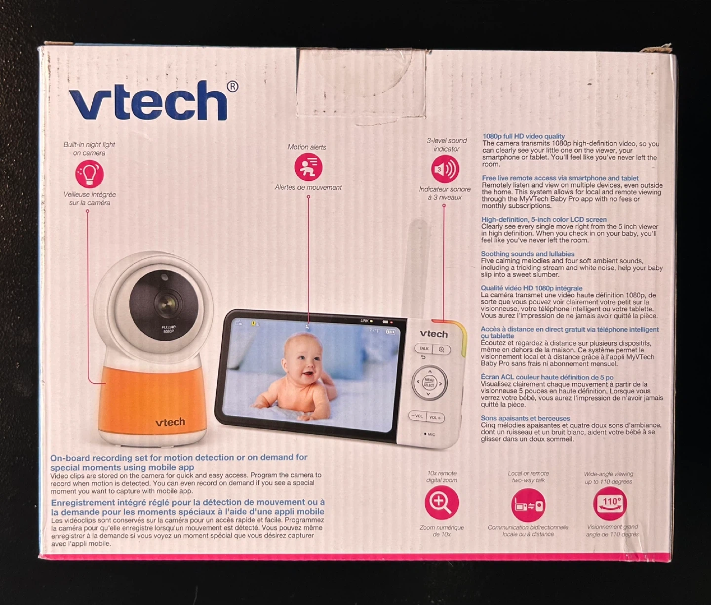 Selling a VTech 5" Smart Wi-Fi 1080p Video Monitor. It comes with the box. Key features include: - 5-inch colour LCD screen - 1080p full HD video quality - Wide-angle viewing up to 110 degrees - On-demand recording for motion detection - Soothing sounds and lullabies - Temperature sensor - Automatic infrared night vision