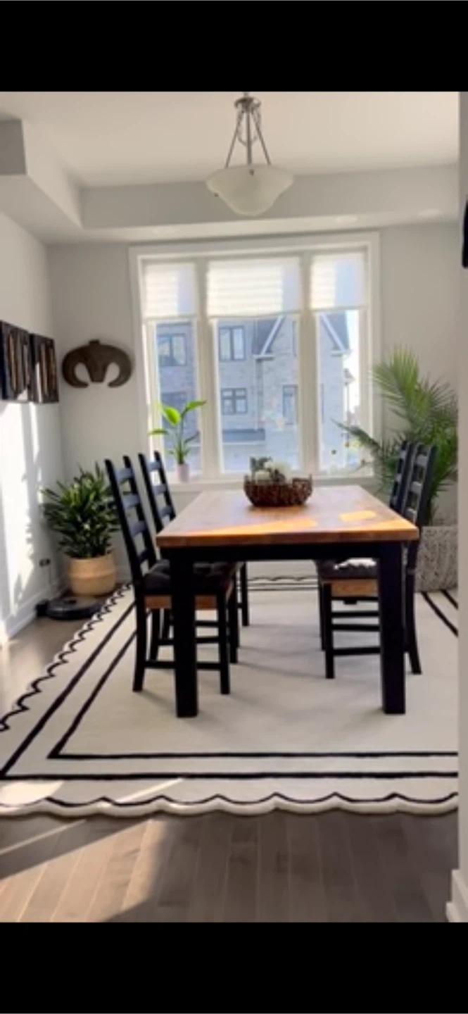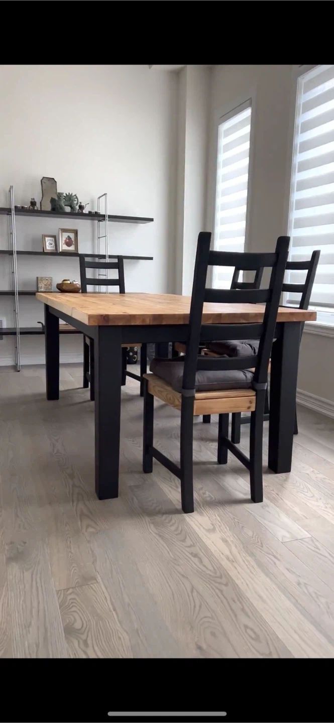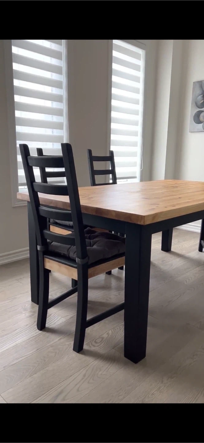 Selling a IKEA dining table with four chairs. The table has a wooden top hand finished black legs, while the chairs are black with cushioned seats. Perfect for a kitchen or dining room!