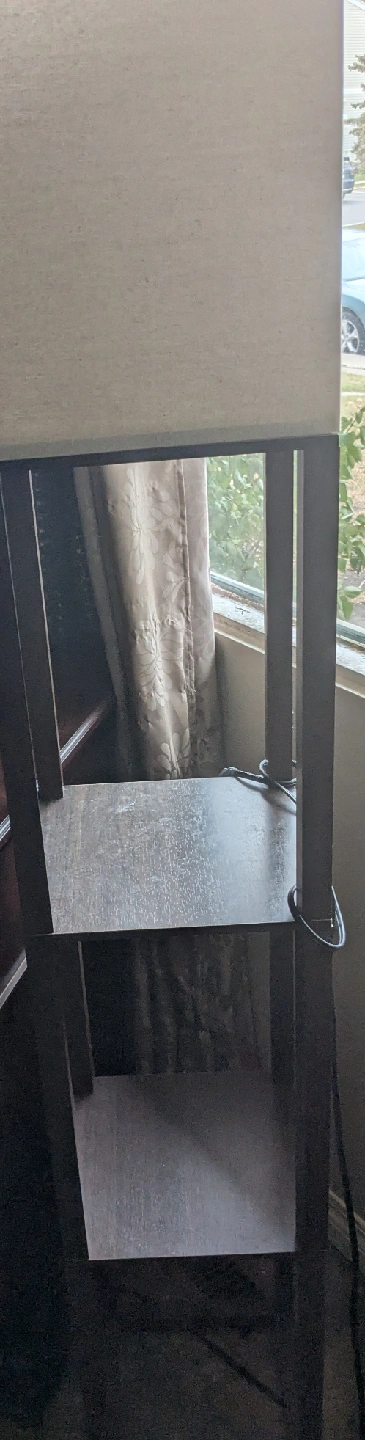 I'm selling a floor lamp with wooden shelves. It's a great way to add light and storage to any room. The lamp is in good condition and comes with the bulb.