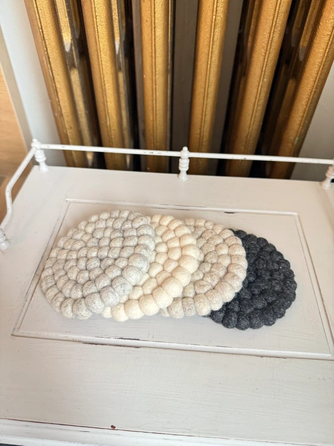 From Anthropologie, this set of four felt wool pompom coasters are so adorable and durable! They're in brand new condition and come in a neutral colour palette: cream, beige, light grey, and charcoal.