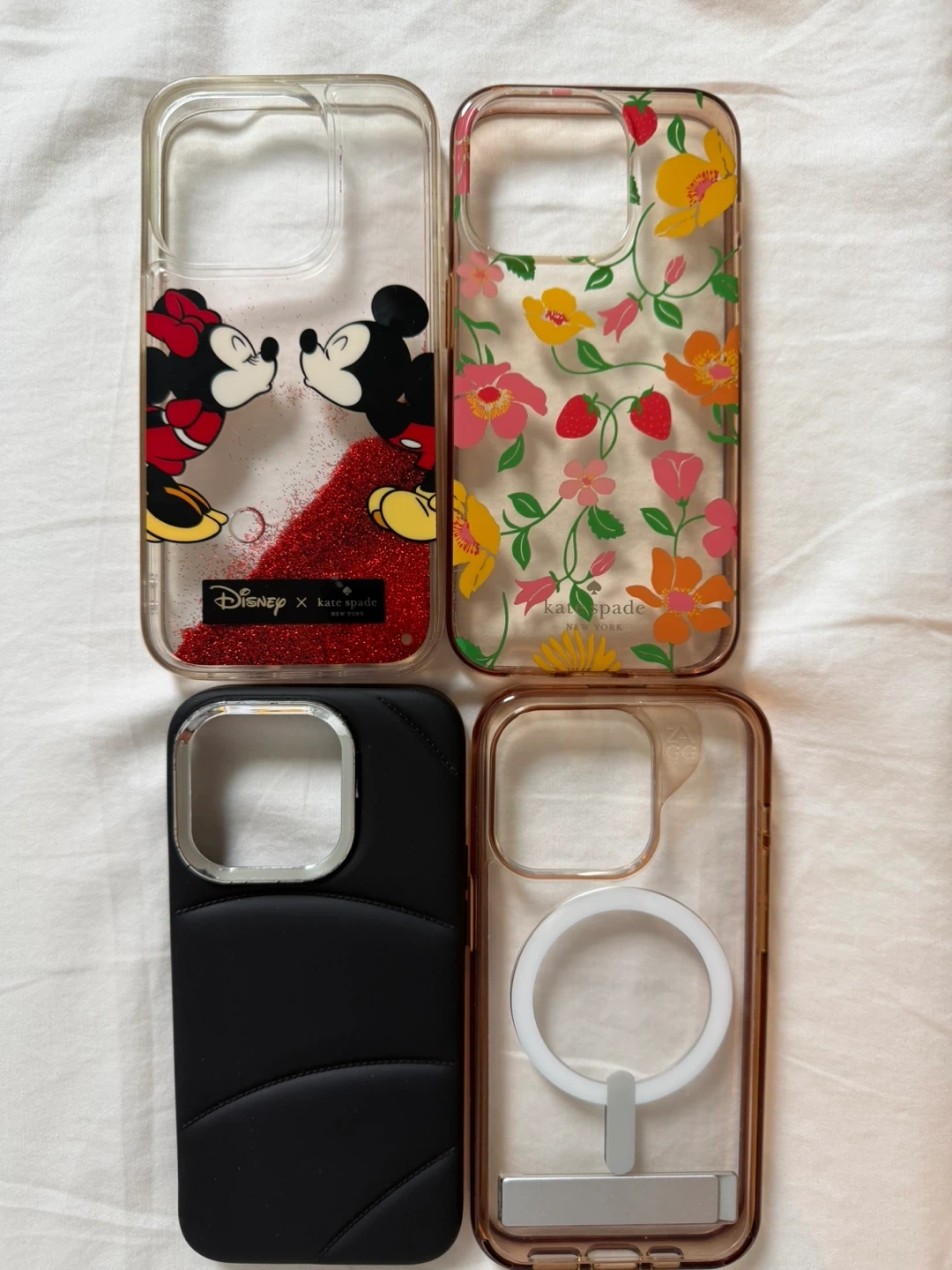 Selling a few cute iPhone cases! There's a Disney x Kate Spade case with Mickey and Minnie, a floral Kate Spade case, a black quilted case, and a clear ZAGG case with MagSafe compatibility