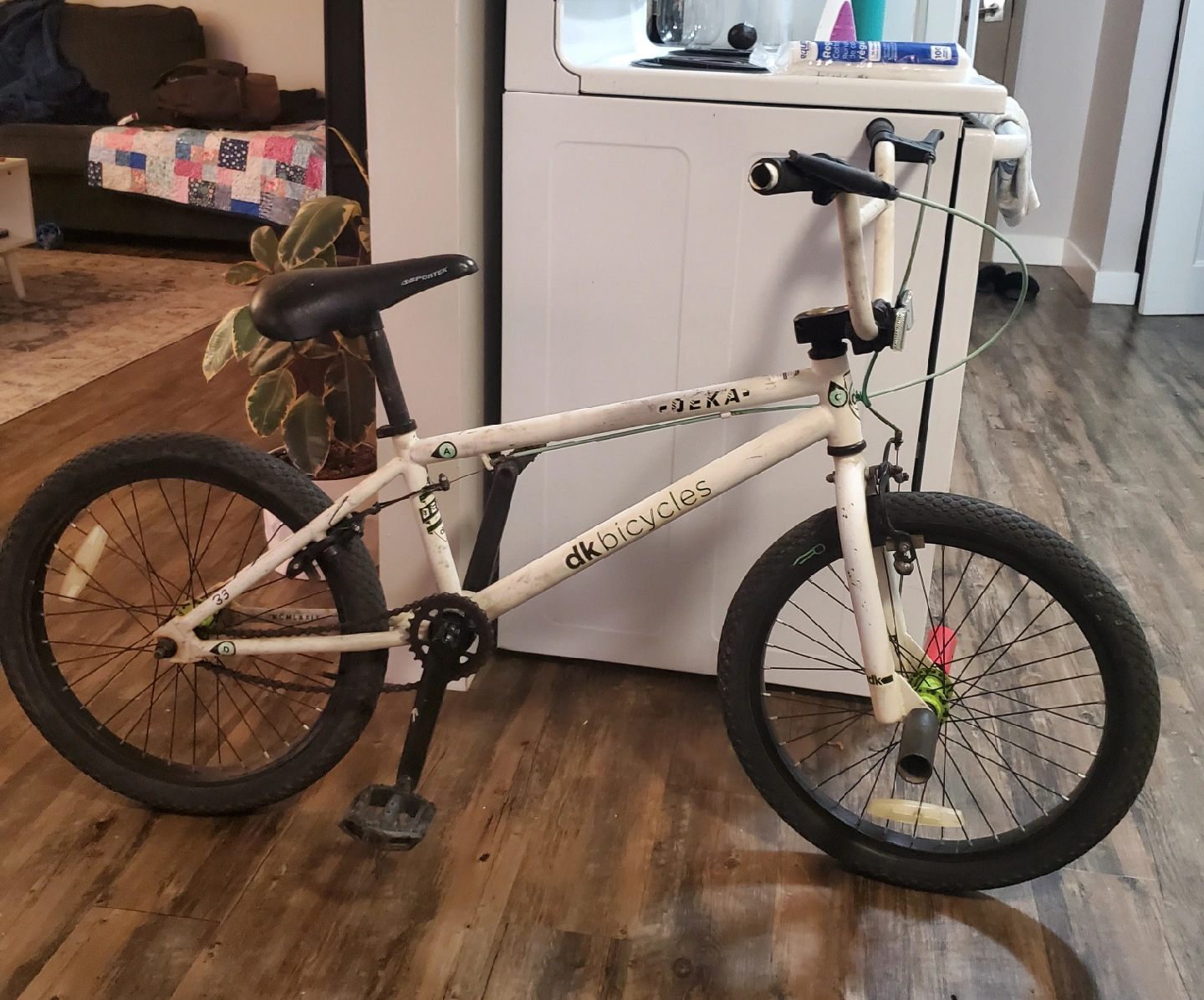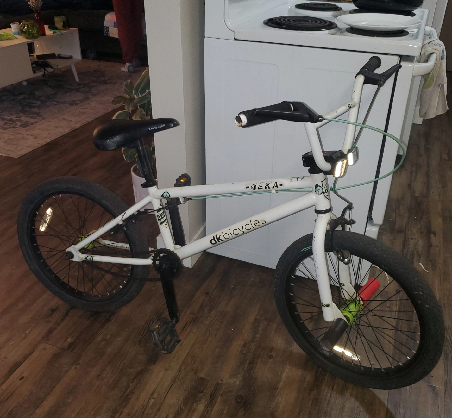 White DK Bicycles BMX bike. Needs new chain, perfect for someone handy with bikes. Is a little dirty but can be cleaned, willing to do for serious buyers. Tires and everything else good. Originally costs $330 and now discontinued. Selling at Karots suggested price! $130, OBO