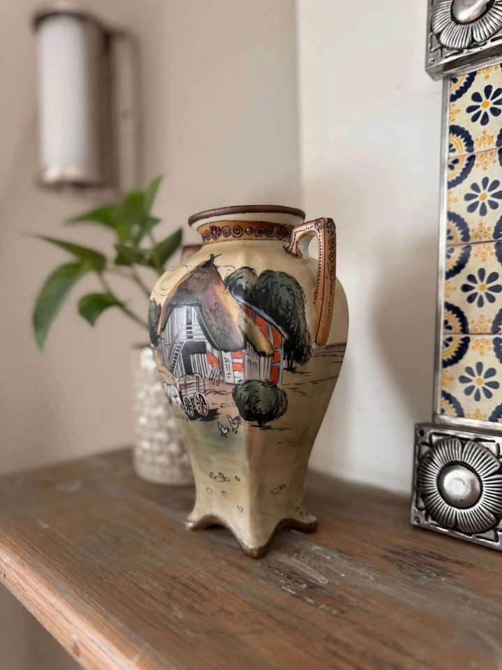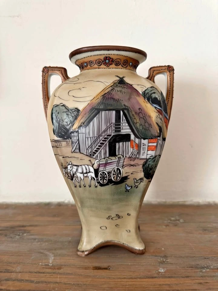 A beautiful and rare Antique Nippon vase, hand-painted by the Morimura Bros. (pre-Noritake). This piece features a charming, detailed scenic landscape with a thatched barn/cottage, farm animals (oxen/geese), and a cart.