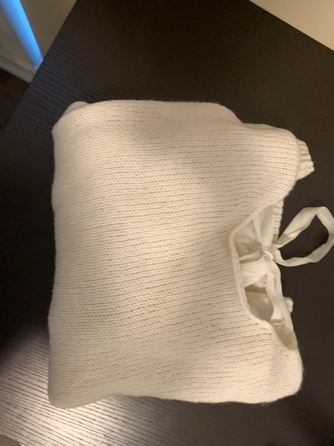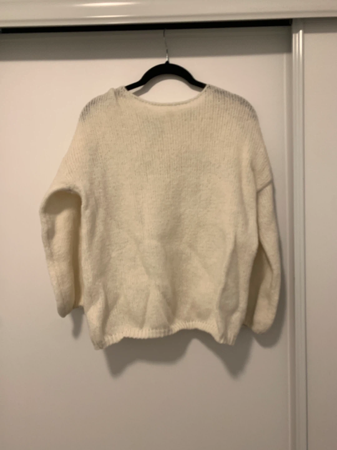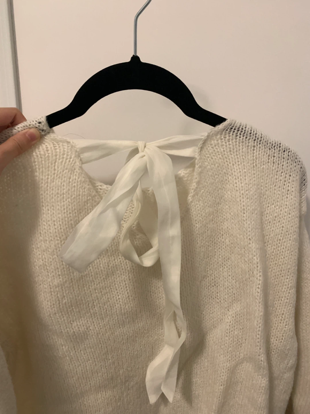 Selling a cozy cream-coloured knit sweater. It has a cute tie detail at the back. Perfect for layering or wearing on its own. It's in great condition and ready for a new home!