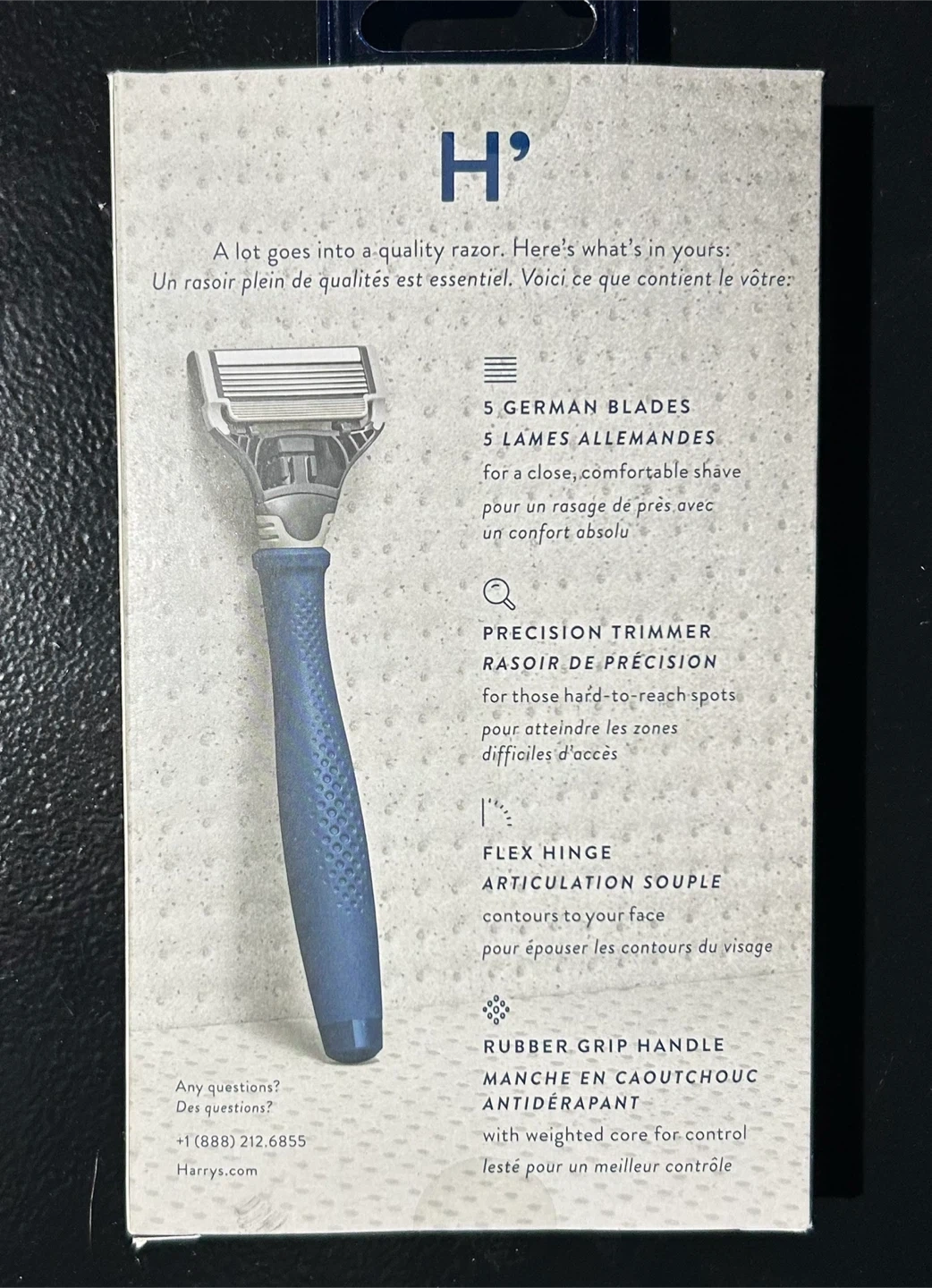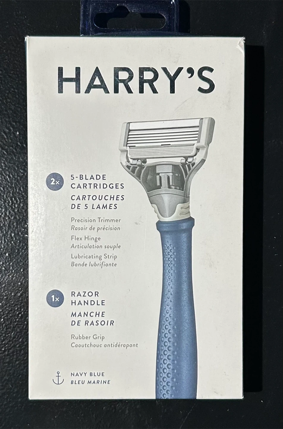 Looking to sell a Harry's razor set in navy blue! It comes with a razor handle and 5-blade cartridges for a close and comfortable shave. The razor features a precision trimmer, flex hinge, and rubber grip handle. Perfect for those hard-to-reach spots!