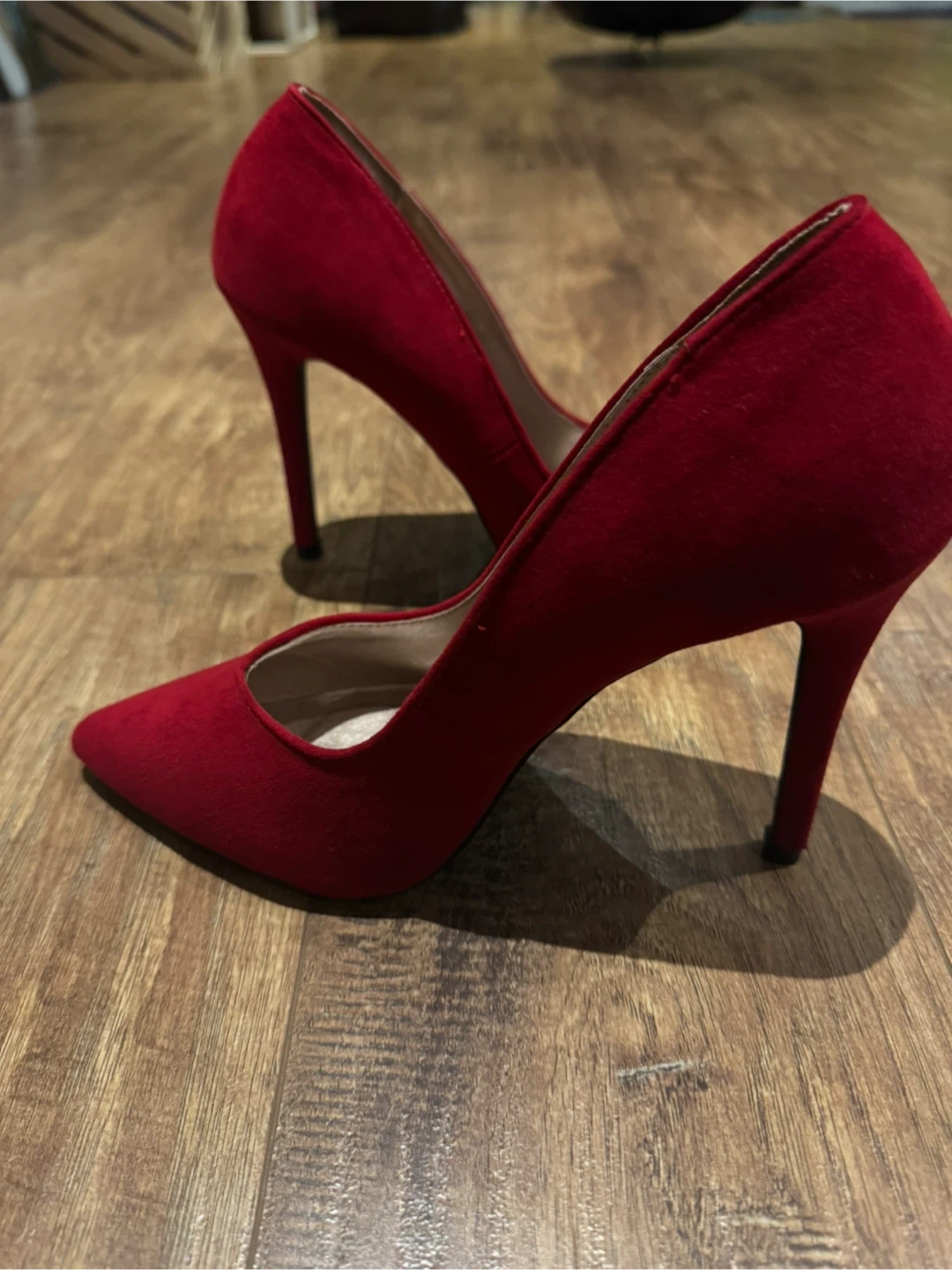 Selling a pair of red suede heels in size 7. They're in great condition and would be perfect for a night out or a special occasion! The heels are a vibrant red colour and the suede material gives them a luxurious feel