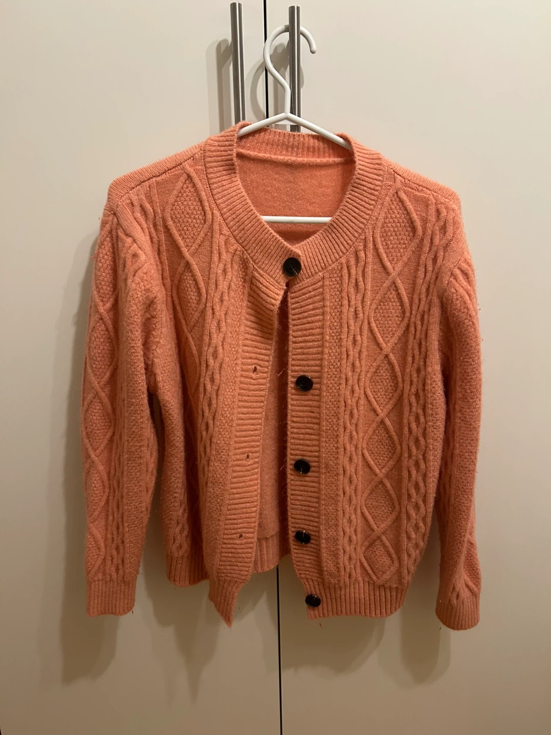 Cozy faux cable knit cardigan with dark brown buttons. Perfect for layering on those cooler days! S/M