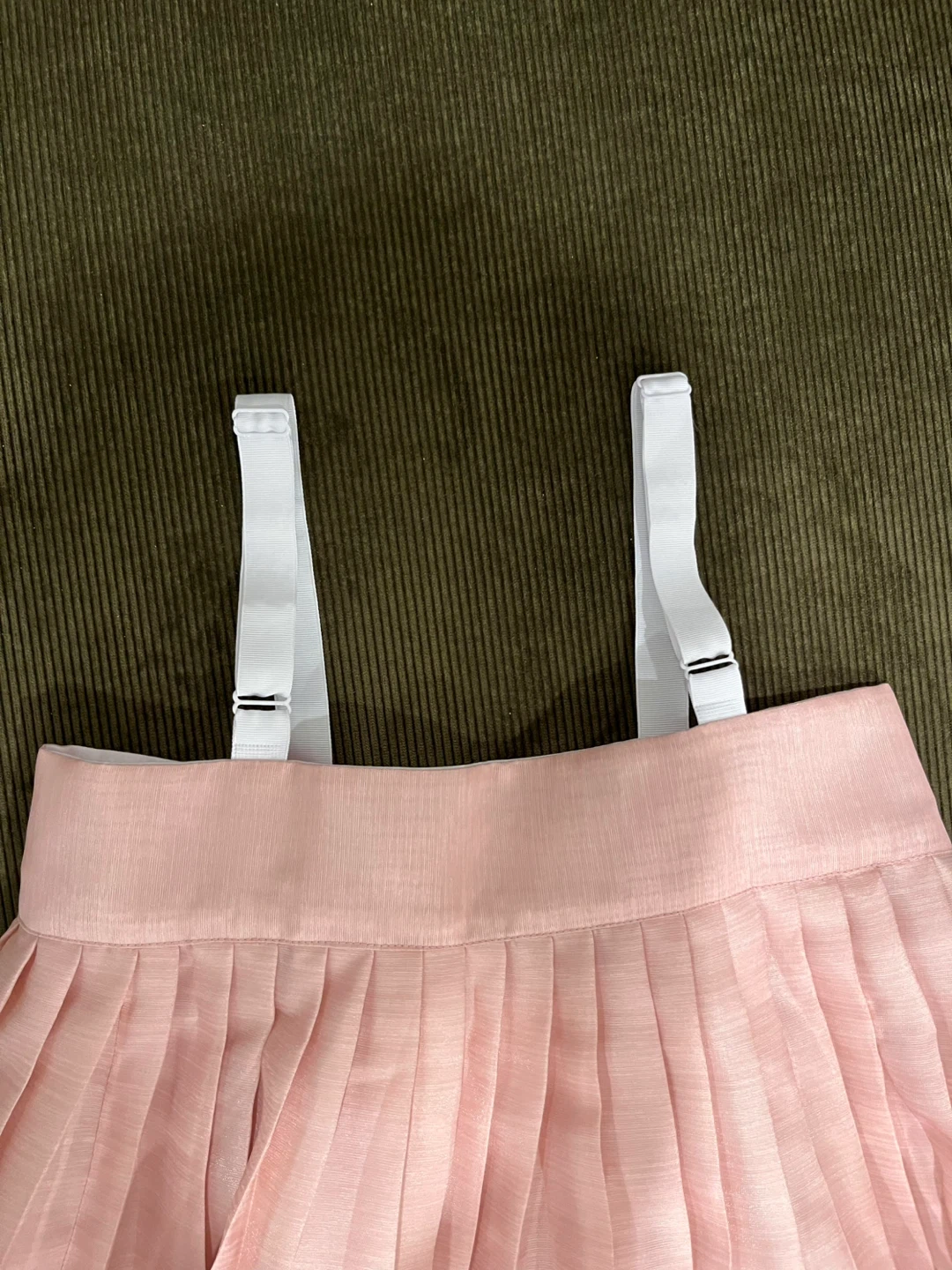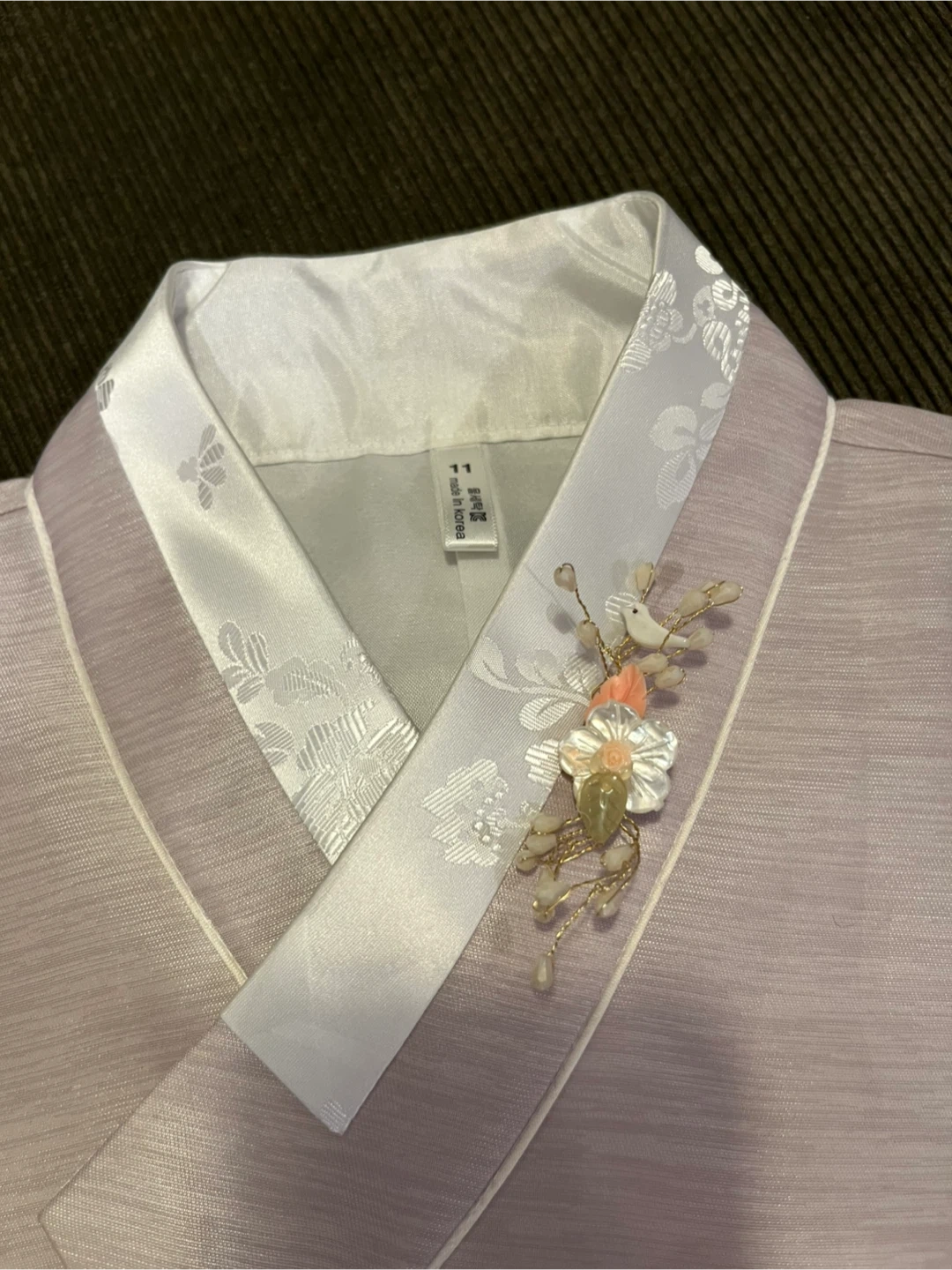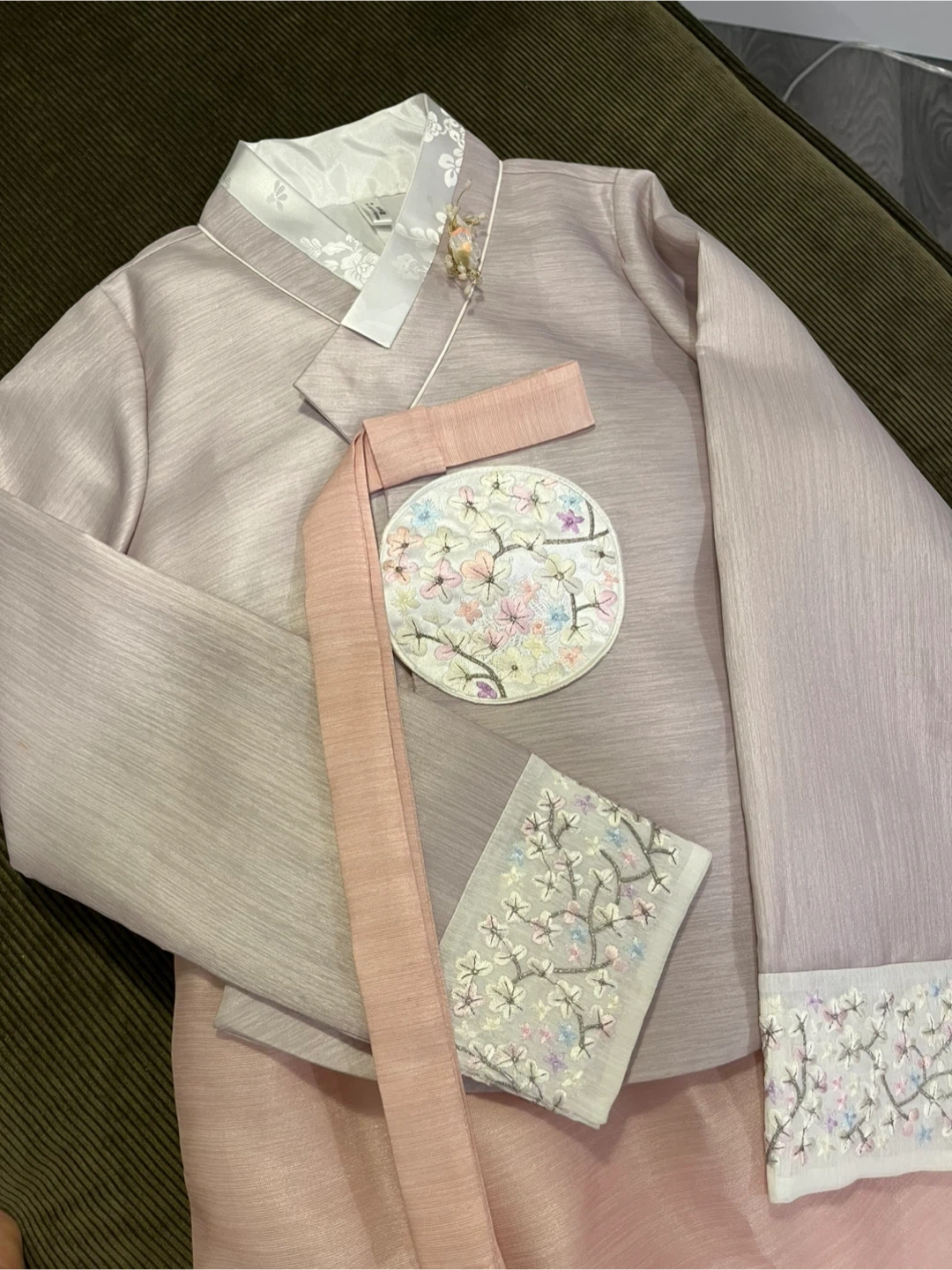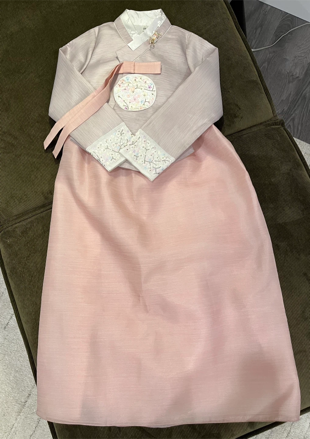 This set includes a dress with adjustable straps, an embroidered top featuring beautiful detailing, a decorative accessory pin, and a petticoat skirt. The petticoat was not worn, as the dress provides ample volume on its own.