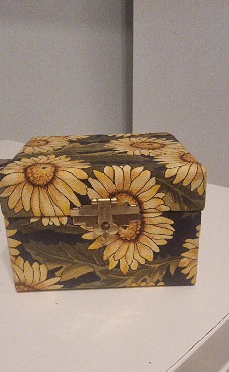 Selling a cute little storage box with a sunflower pattern. It's in great shape and perfect for storing small items like jewelry or trinkets. The inside is lined with a soft, dark fabric to protect your valuables. It has a metal clasp to keep it securely closed.