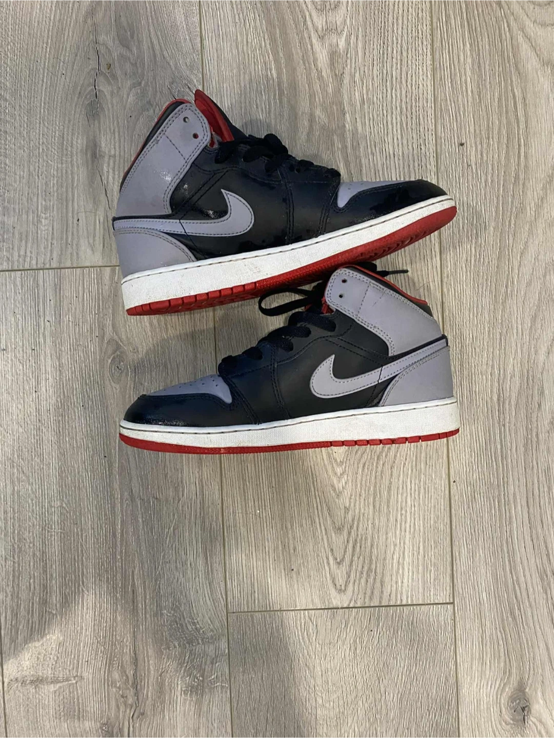Selling a pair of Air Jordan 1 Mid sneakers in a sleek black, grey, and red colourway. They are in good condition and ready for a new home!