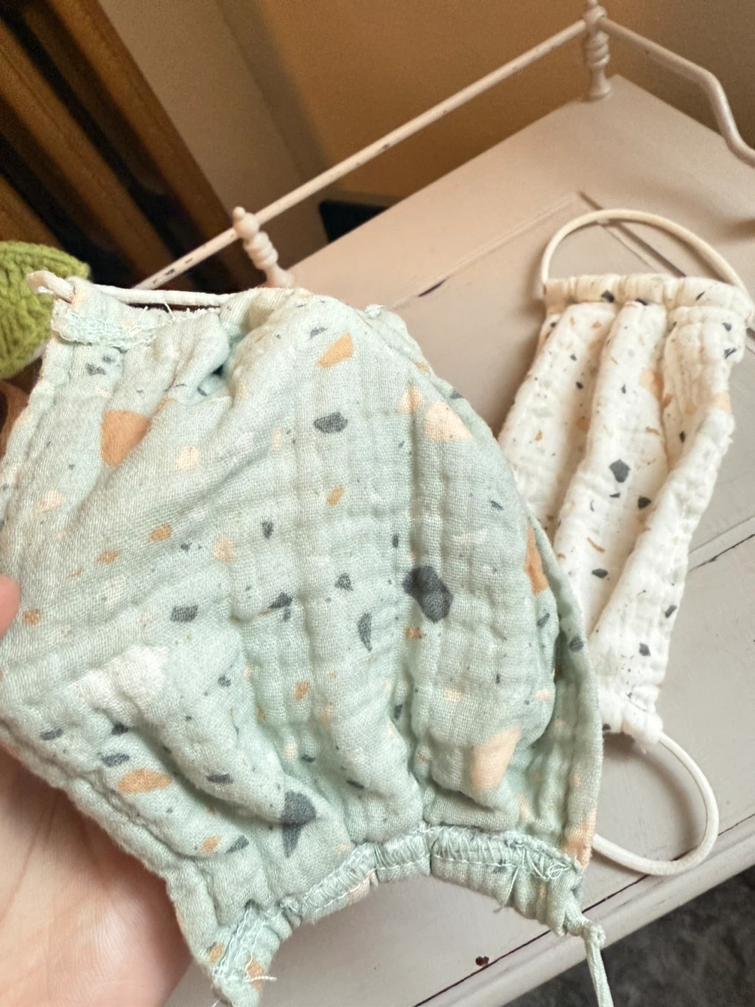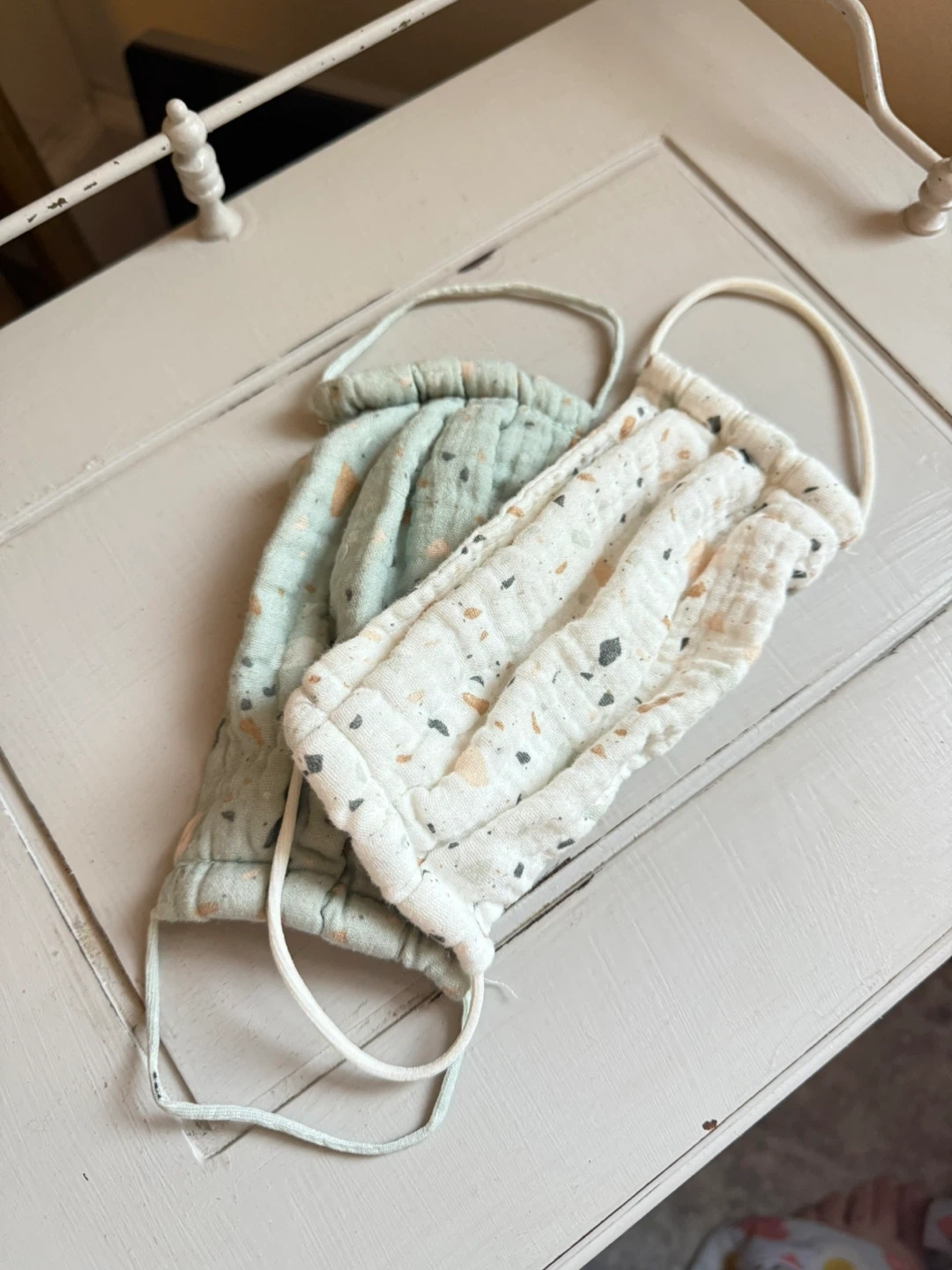 One is a light blue-green colour and the other is white. Both have a terrazzo-like pattern, with colourful flecks just like the stone.