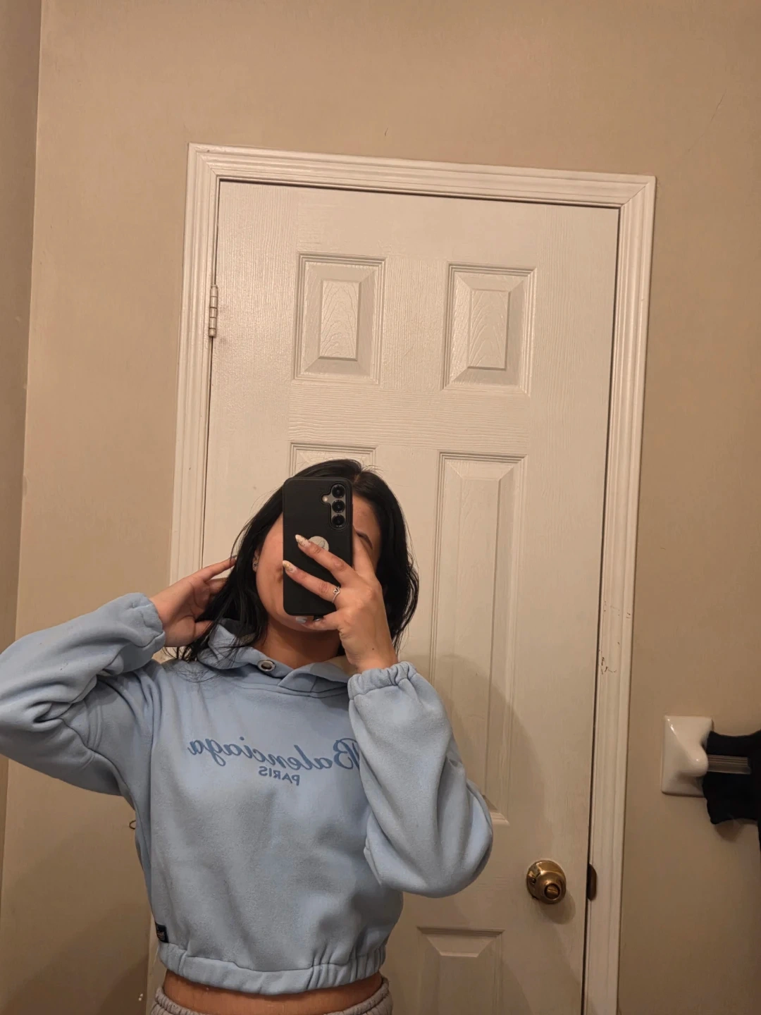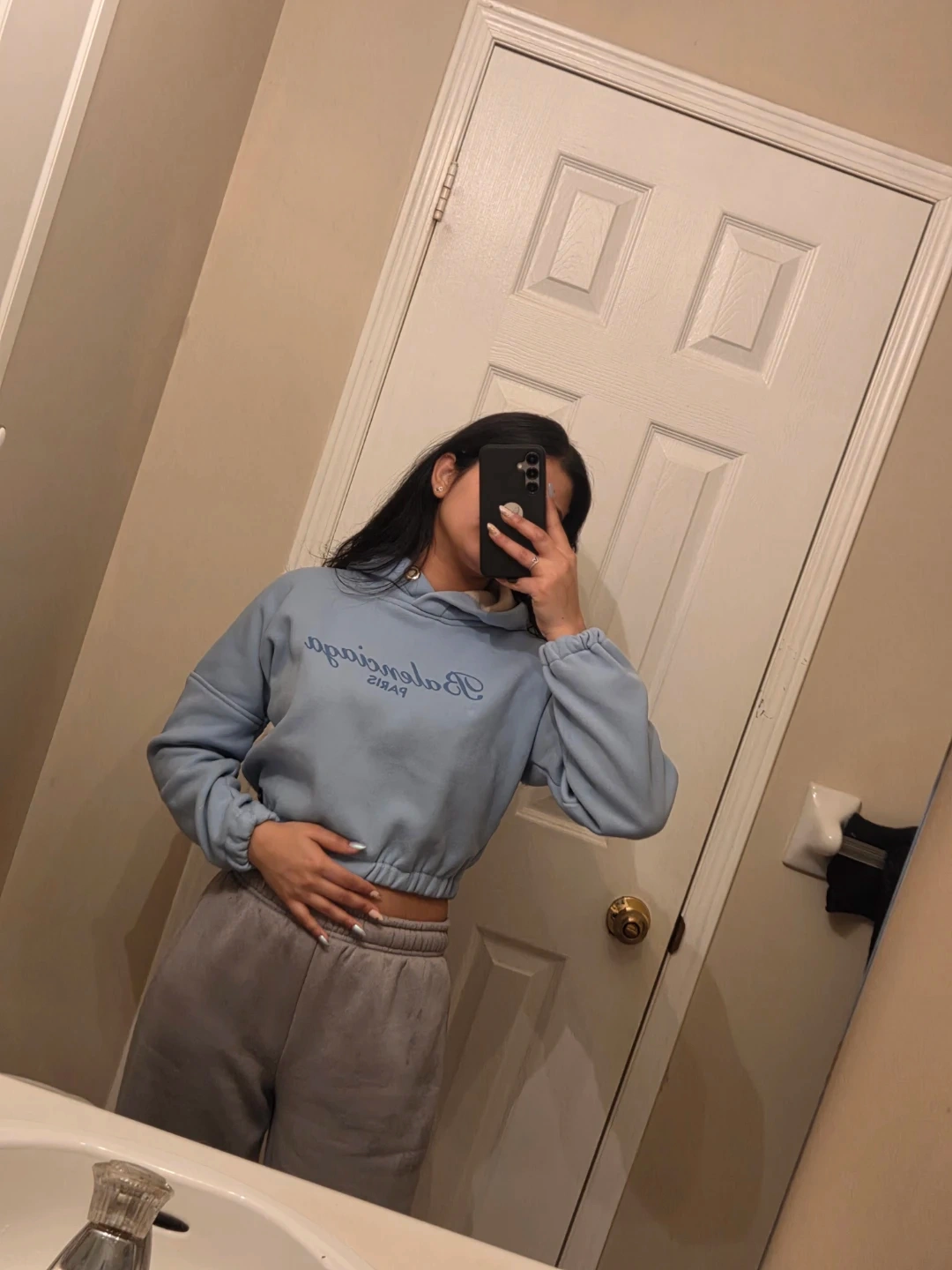 A cozy Balenciaga Paris crop hoodie in a lovely light blue colour! It's in great condition and ready for a new home. The material is soft and comfortable, perfect for those cooler days. It features the Balenciaga Paris logo across the front.