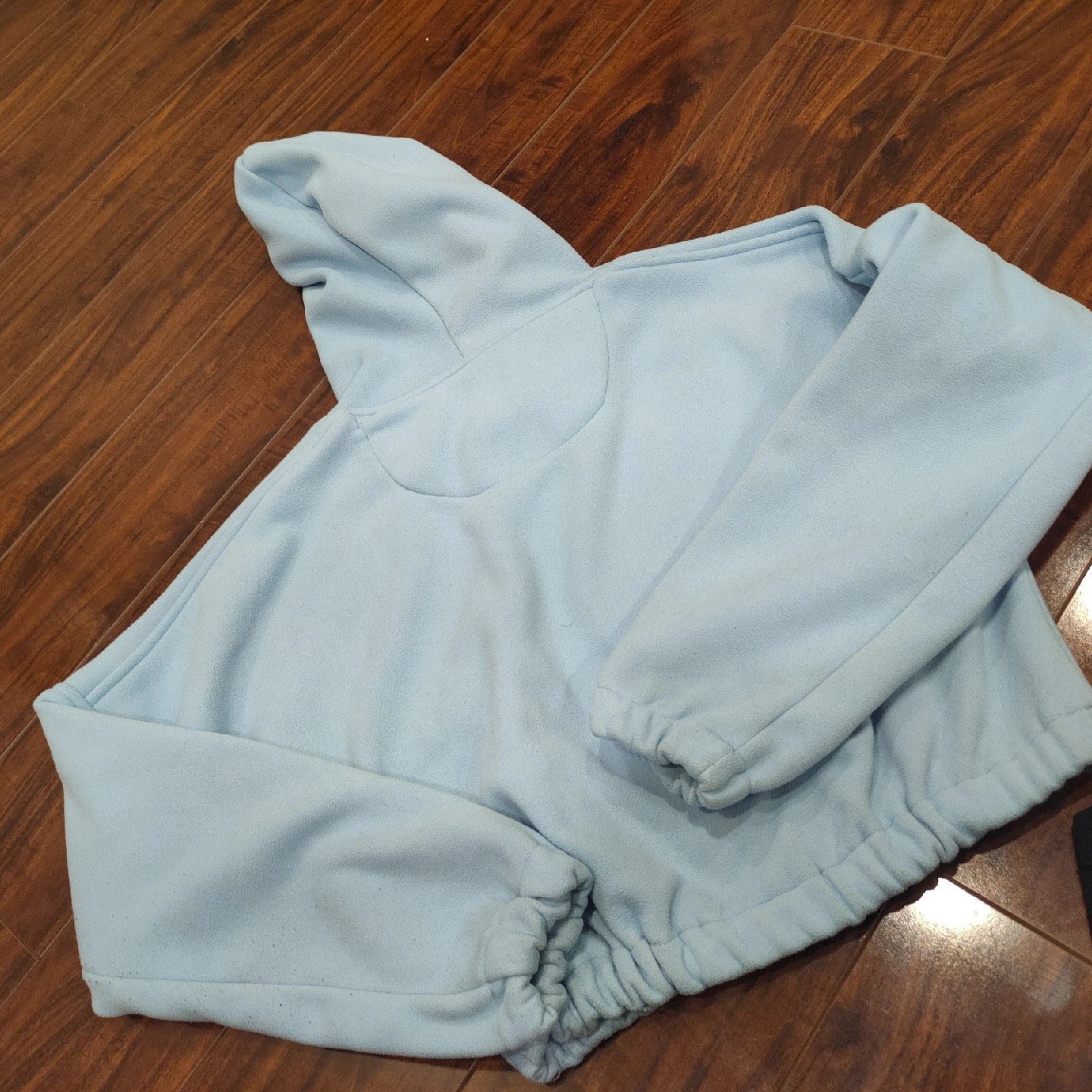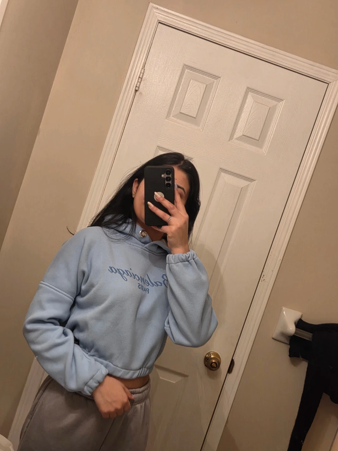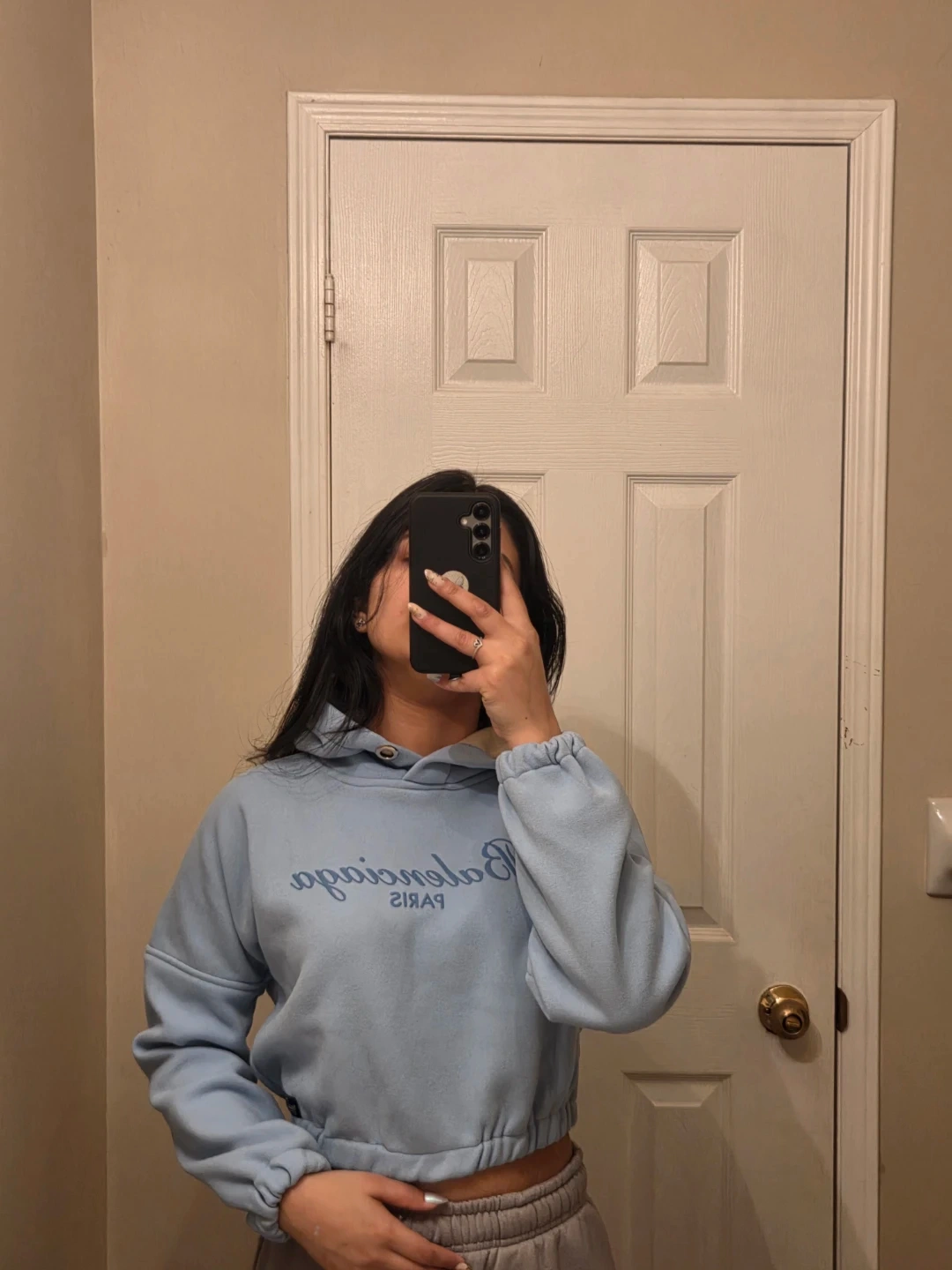 A cozy Balenciaga Paris crop hoodie in a lovely light blue colour! It's in great condition and ready for a new home. The material is soft and comfortable, perfect for those cooler days. It features the Balenciaga Paris logo across the front.