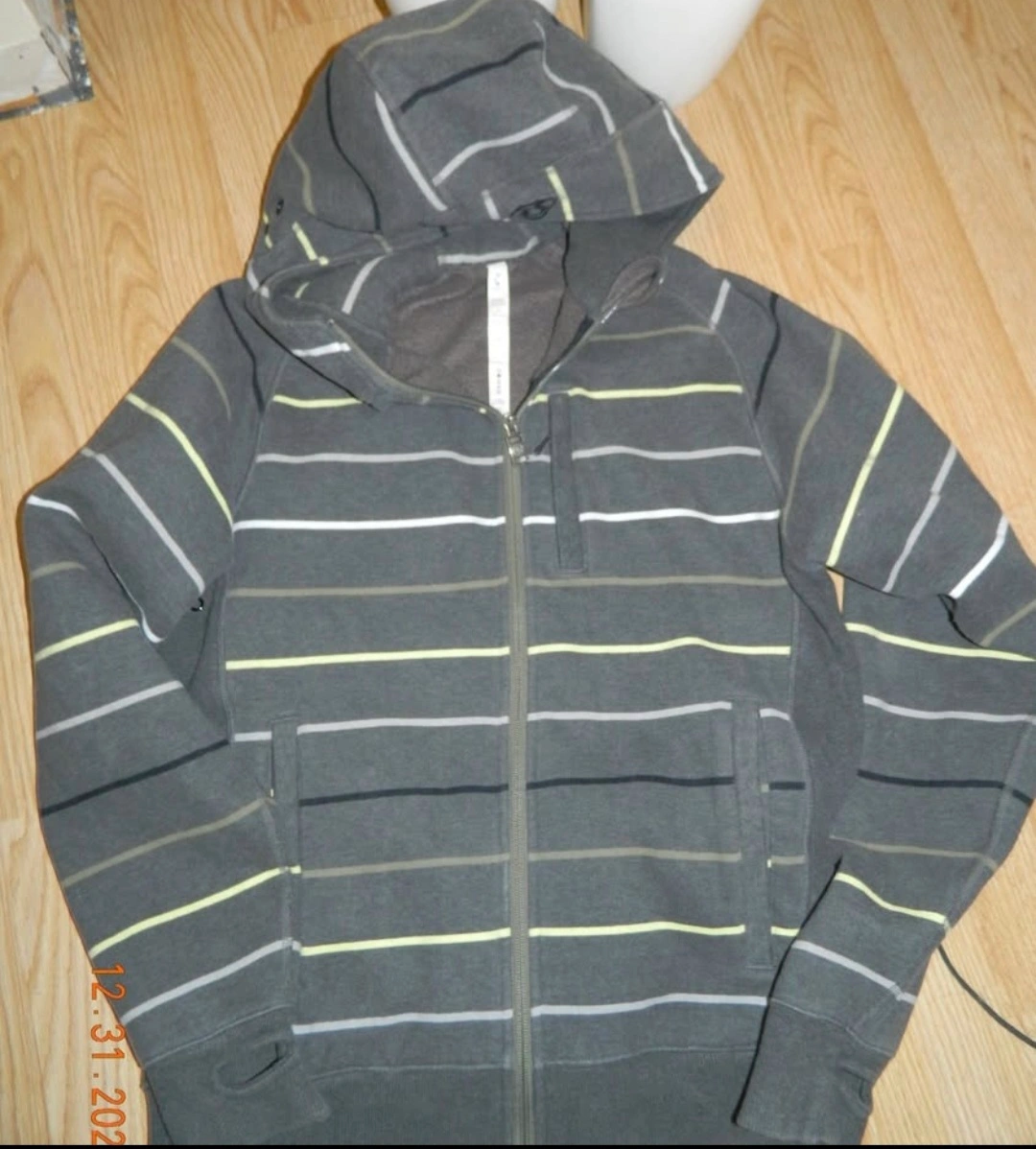 Selling a Lululemon grey hoodie with a striped design. It's in great condition and super comfy for everyday wear. Perfect for layering during the cooler months!