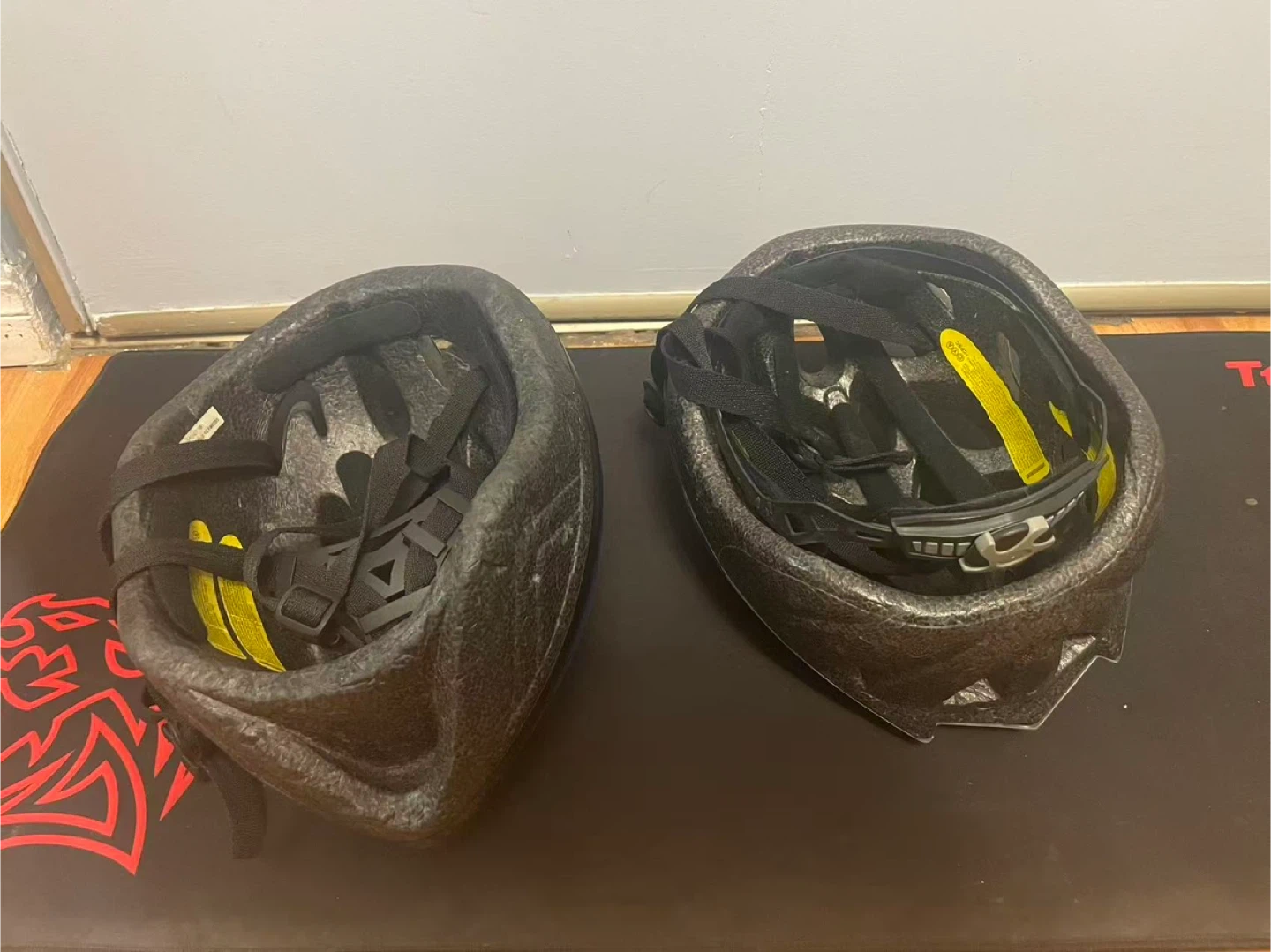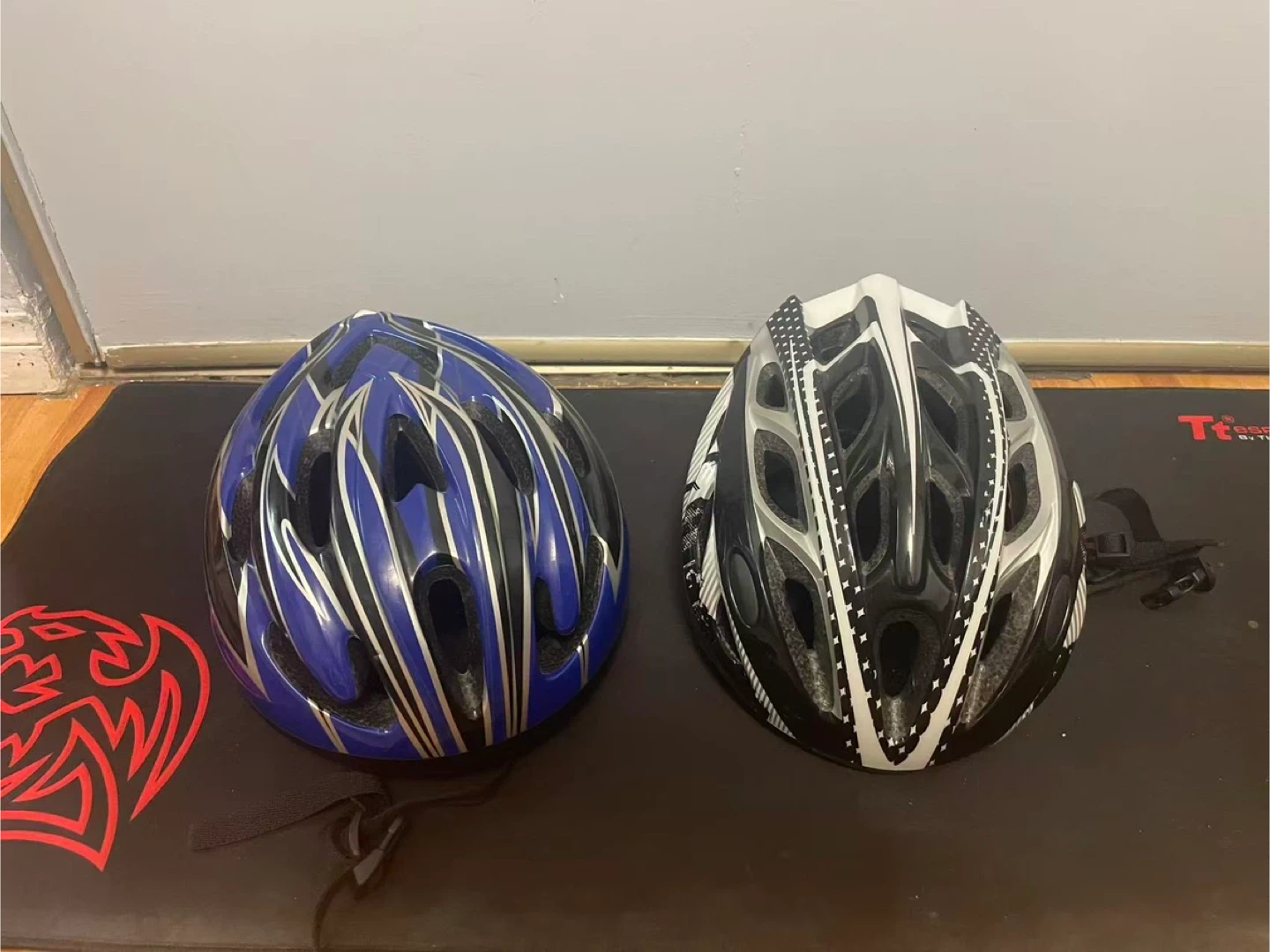 Two Bike Helmets - Blue and Black/White