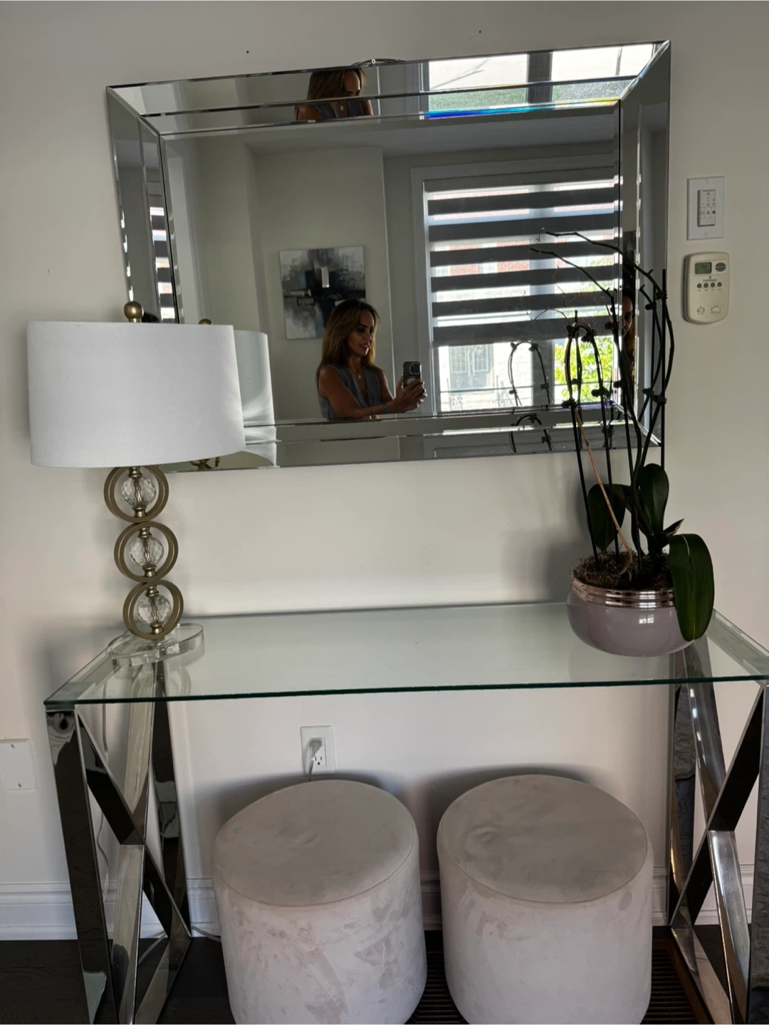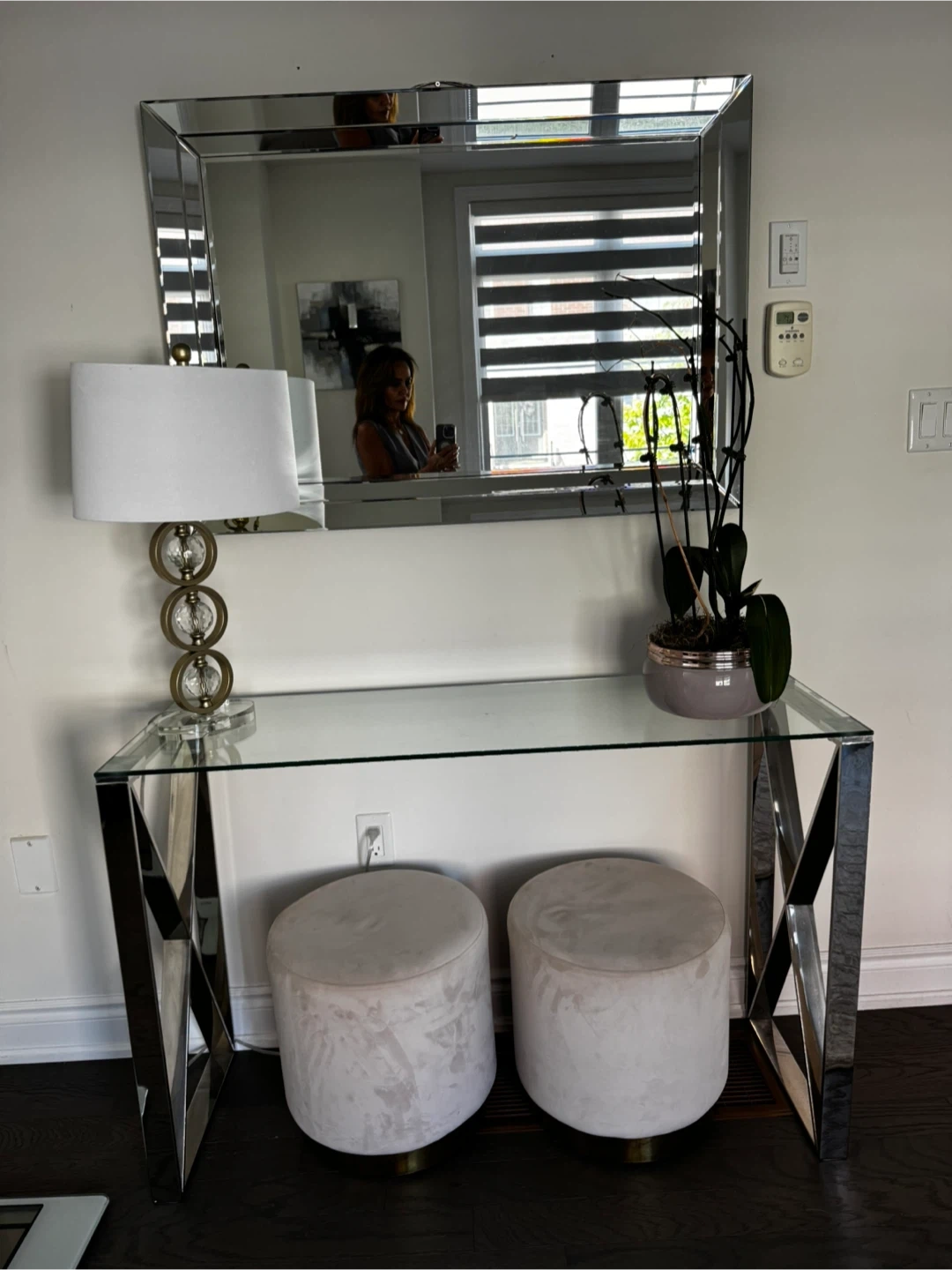 A lovely cream-coloured velvet ottoman with a gold base. It's in great condition and would be a stylish addition to any room!