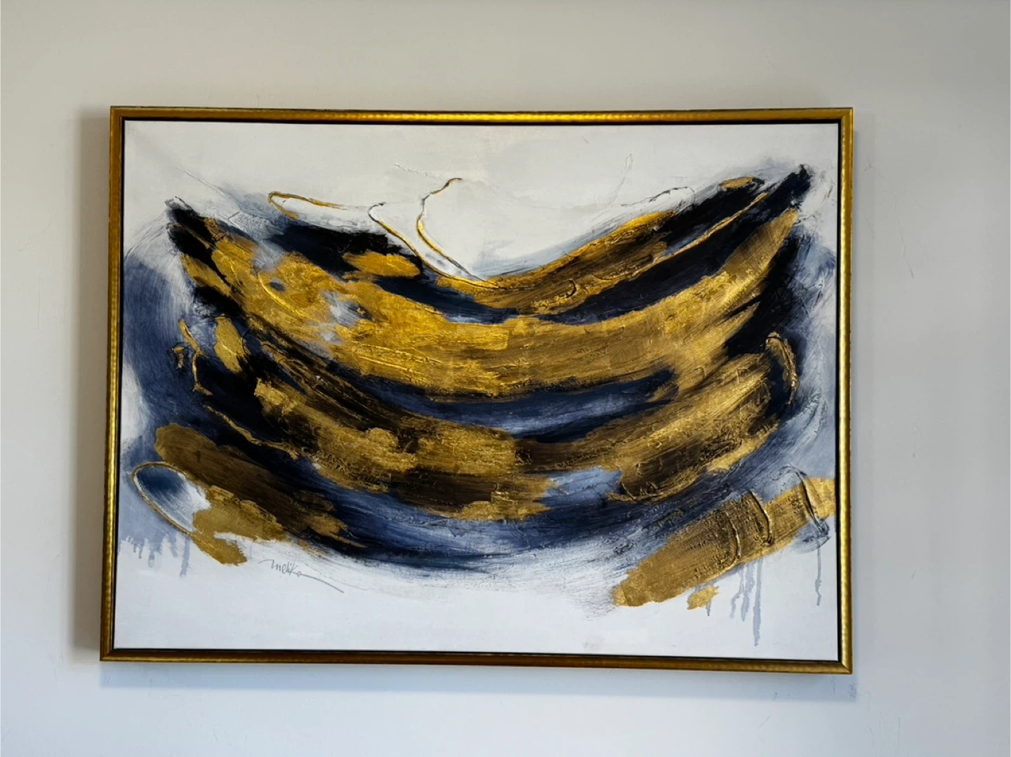 96Here's a beautiful abstract painting featuring gold and blue brushstrokes. It's framed and ready to hang, adding a touch of modern elegance to any room