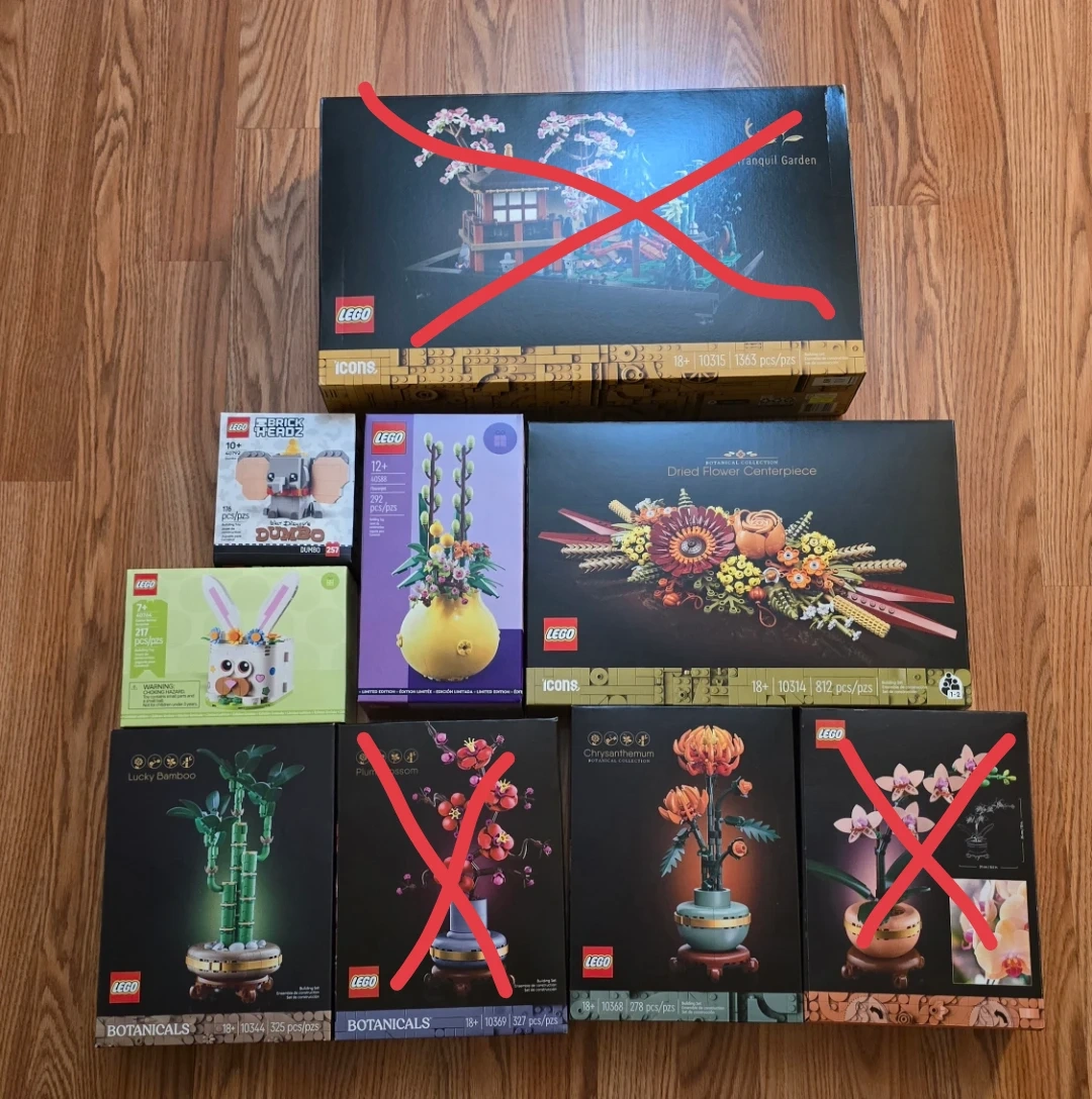 Selling a collection of LEGO Botanical sets, including Lucky Bamboo, Plum Blossom, Chrysanthemum, and Orchid! Also included are the LEGO Icons Tranquil Garden and Dried Flower Centerpiece. There's also a LEGO Brickheadz Dumbo and LEGO 40588.