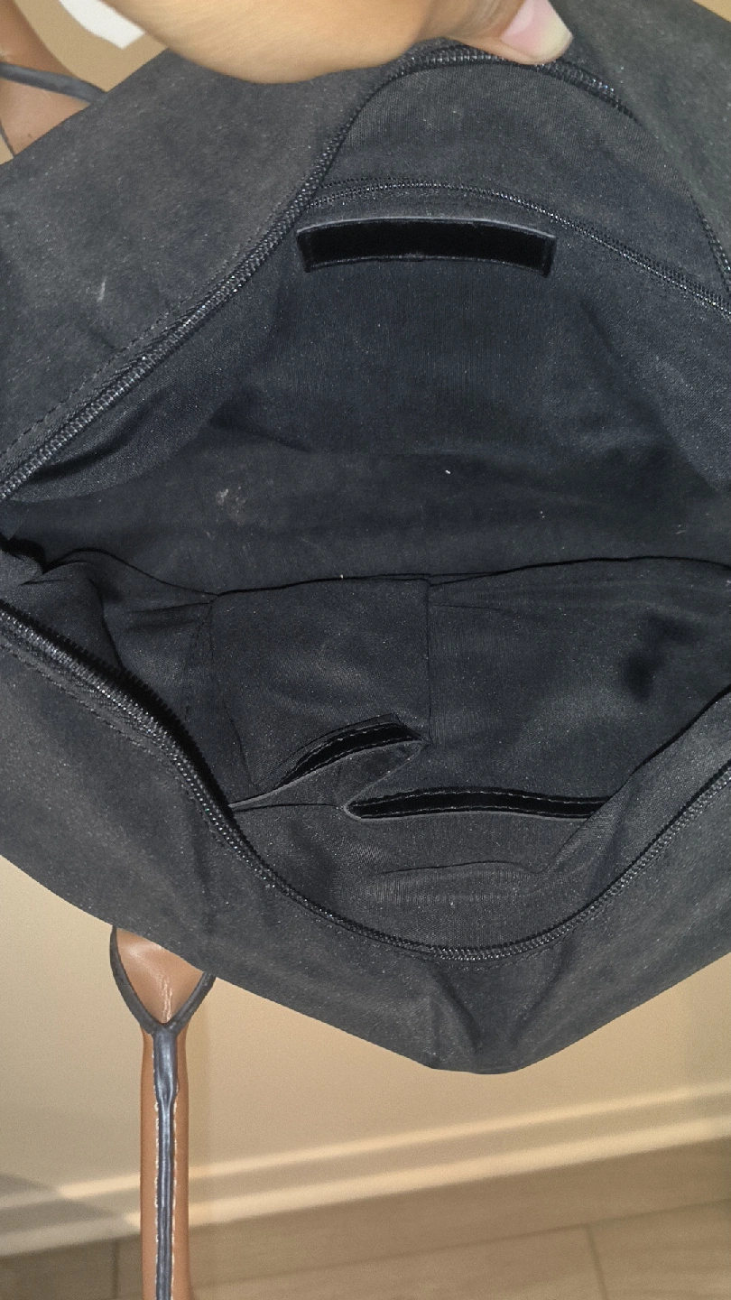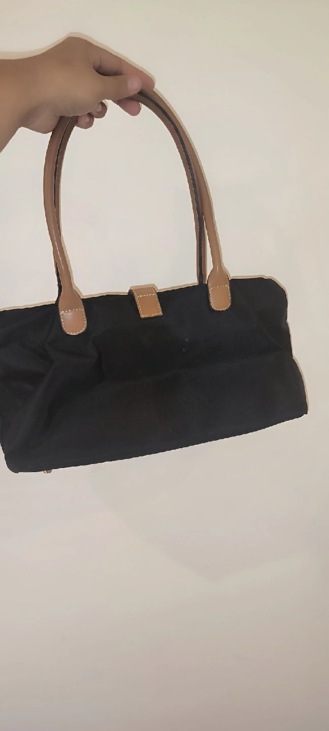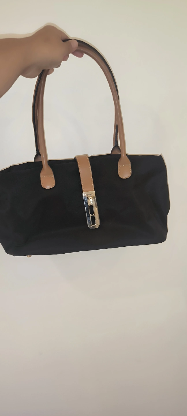 Selling a black tote bag with tan handles. It's in good condition and has a zipper closure. Perfect for everyday use