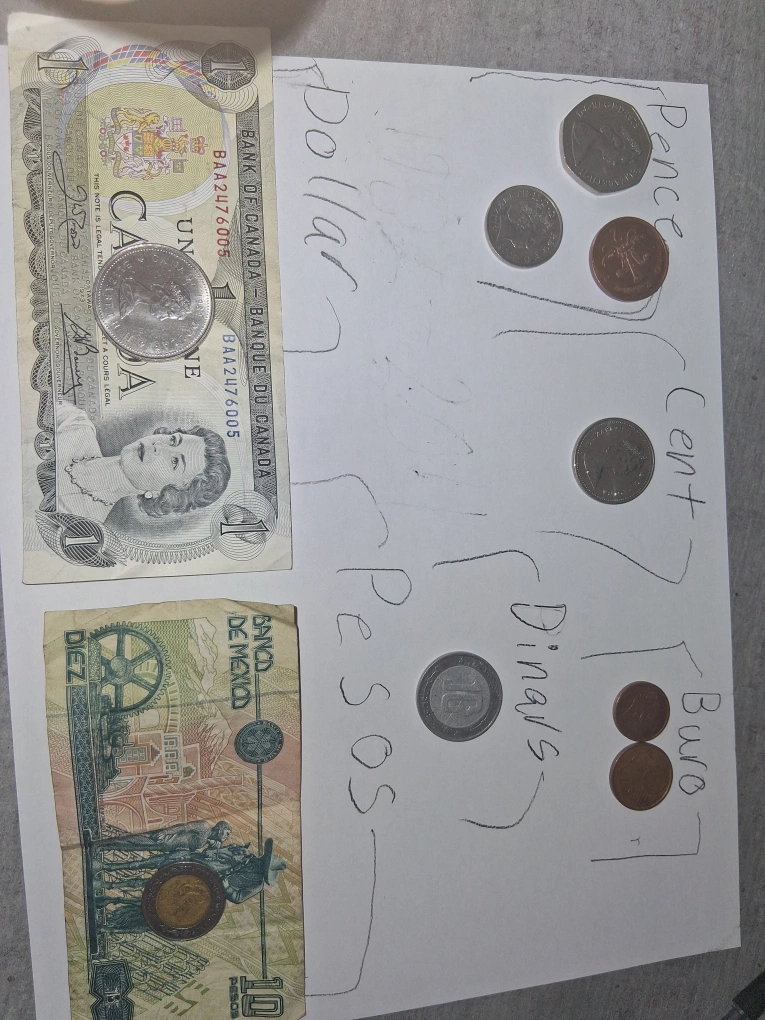10I have a collection of mixed currency available. It includes a Canadian dollar bill and coin, Mexican pesos, British pence, and other international coins. Great for collectors or anyone interested in foreign currency!