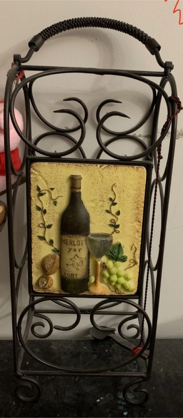 68This is a decorative metal wine rack. It features a decorative tile with a wine bottle, glass, and grapes design. It's perfect for adding a touch of rustic charm to your home bar or kitchen!