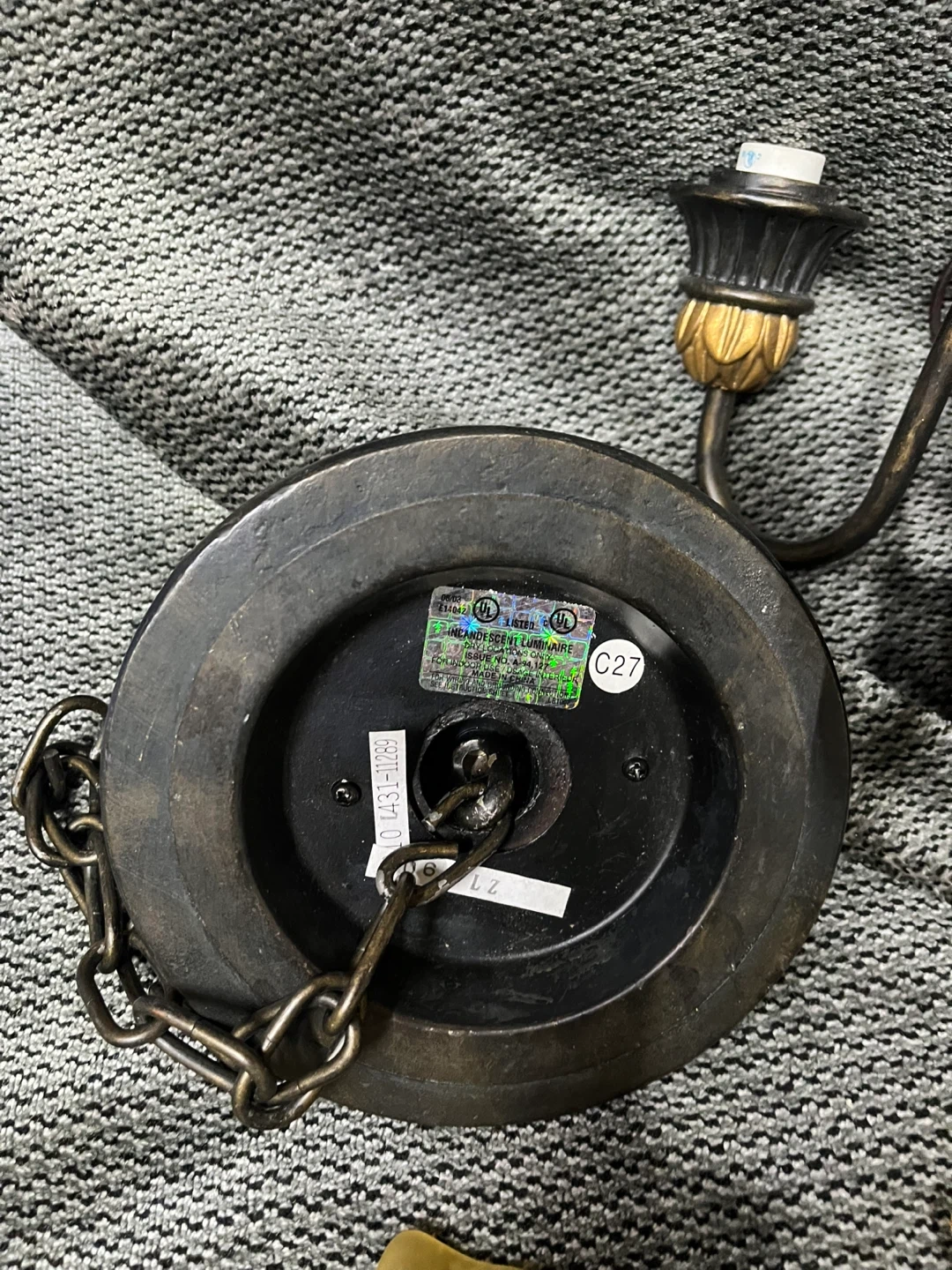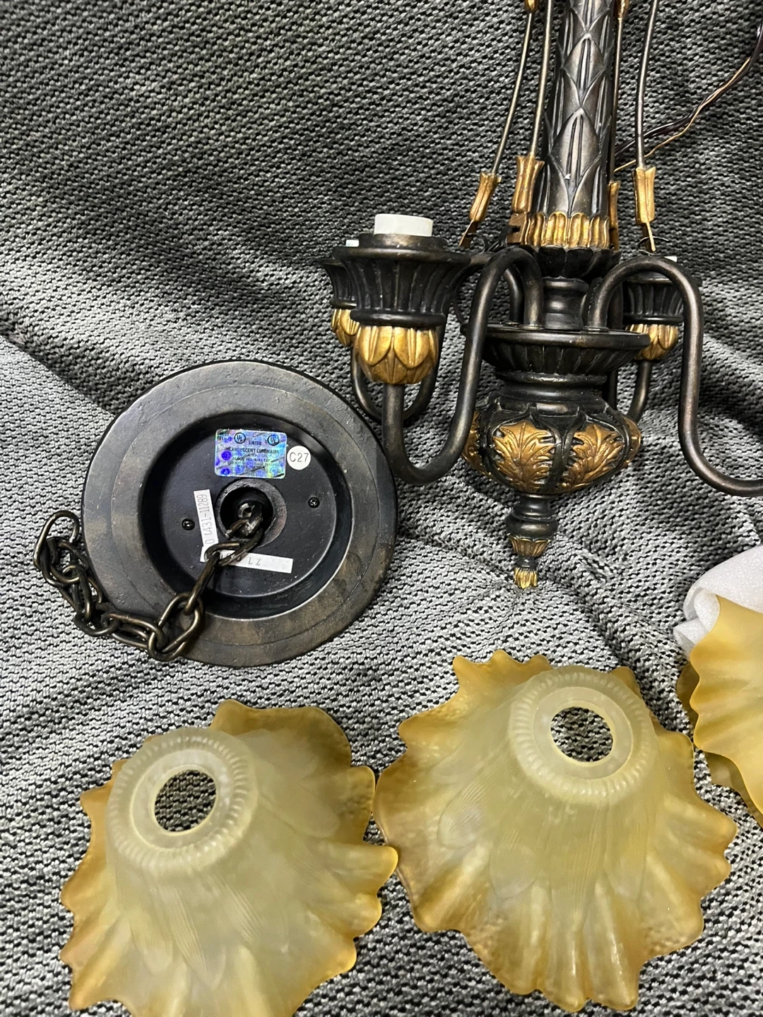Selling this chandelier. It features a bronze finish with gold leaf accents and comes with the original chain. The chandelier has 4 lights and includes the decorative glass shades. It's in good condition and ready to brighten up your space!