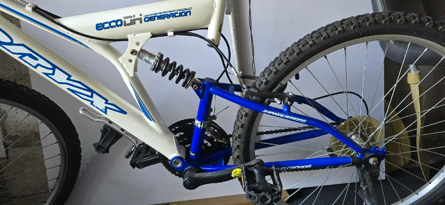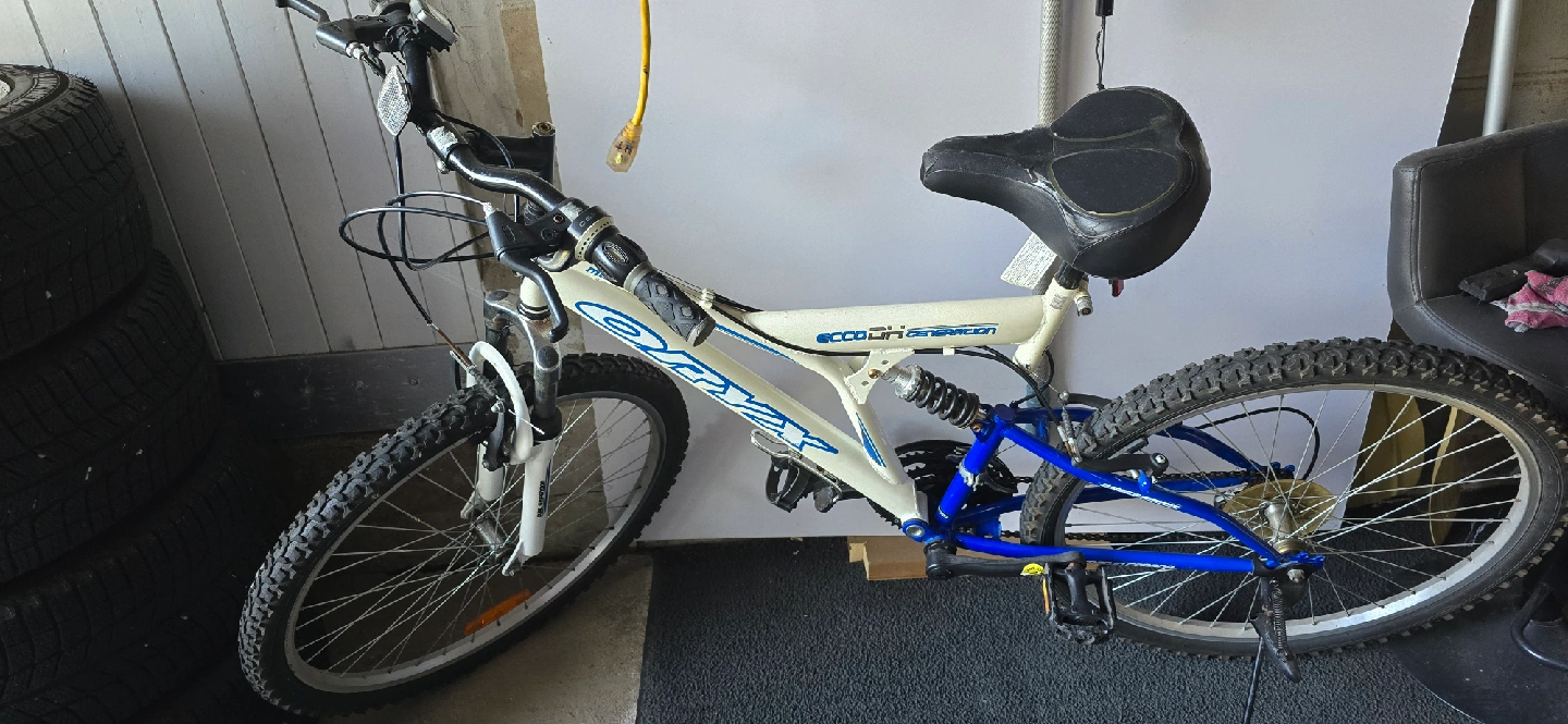 Selling an Ecco! Generation mountain bike. It features a white and blue frame and looks like it would be great for hitting the trails or just cruising around the neighborhood!
