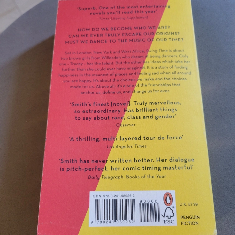 Selling a copy of Swing Time by Zadie Smith! It's a novel set in London, New York, and West Africa, following two brown girls who dream of being dancers. The book explores themes of race, class, and gender. It's a Penguin Fiction edition