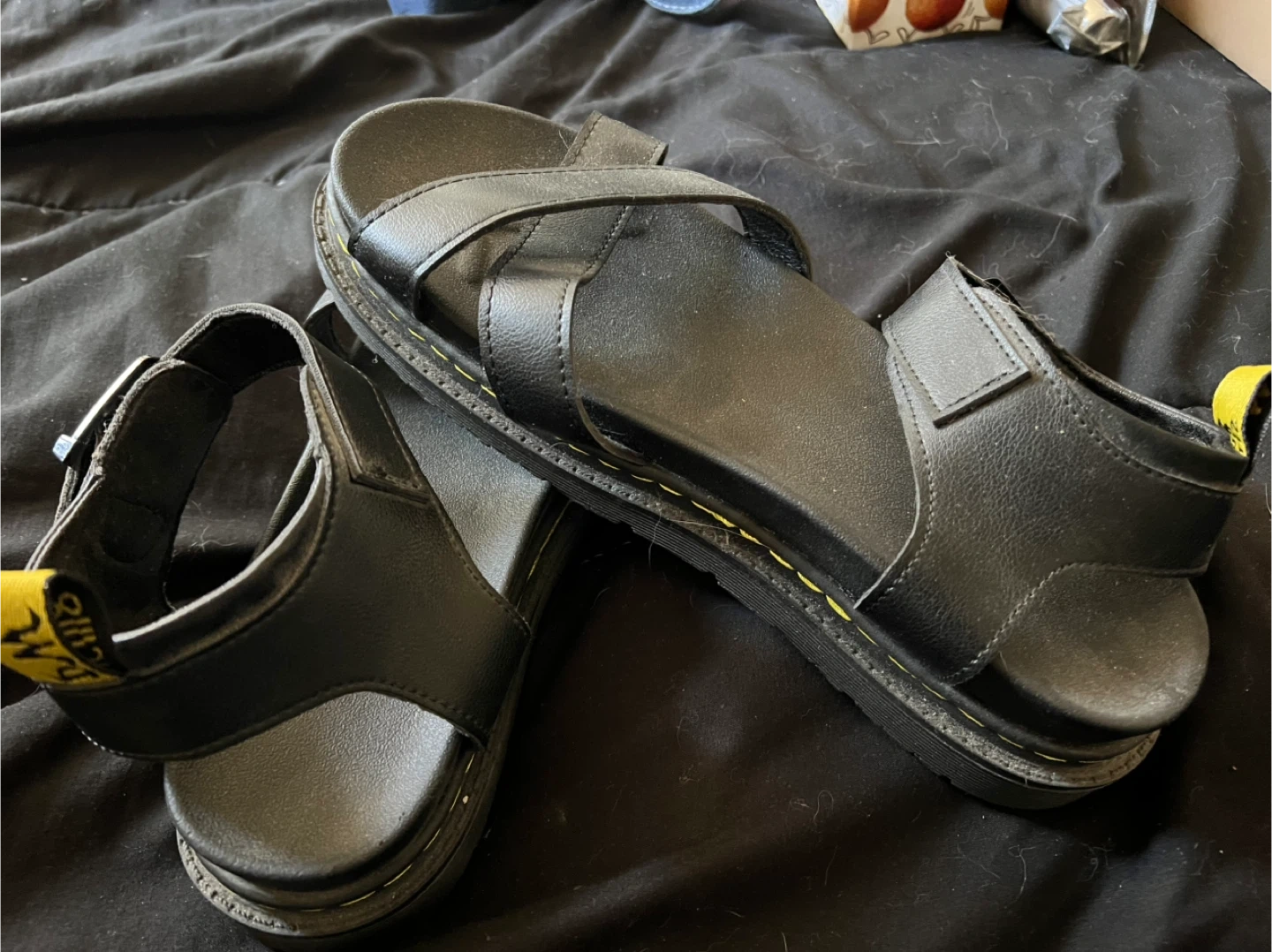Selling a pair of Dr. Martens Gryphon sandals in black leather. These gladiator-style sandals are super stylish and in great condition. The yellow stitching is a classic Dr. Martens detail. They're a size that's perfect for summer!