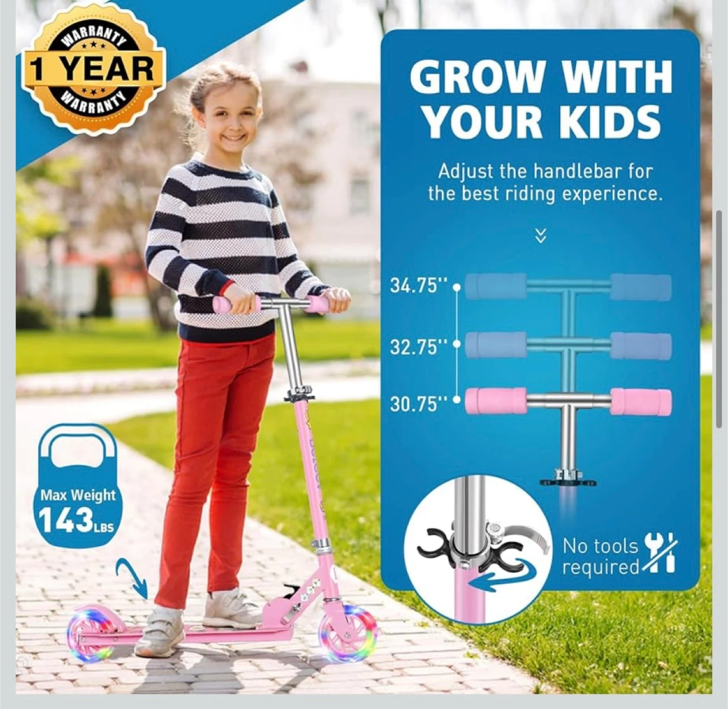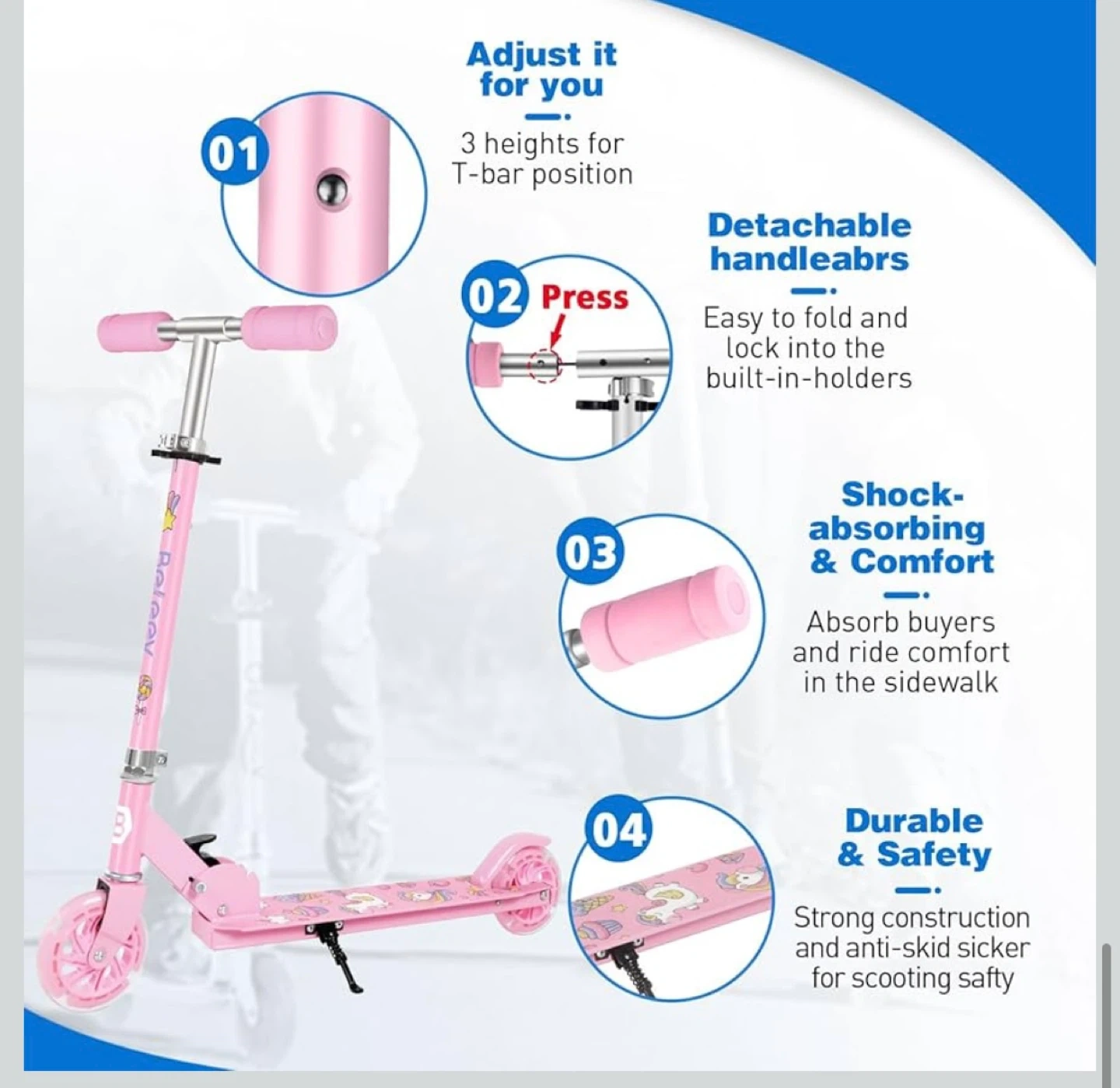 This cute pink scooter is perfect for kids! It has light-up wheels that don't need batteries, which is super fun. The scooter has an extra-wide, non-slip deck for maximum stability and durability. It's also easy to fold, lightweight to carry, and easy to store, making it perfect for travel. The handlebar can be adjusted for the best riding experience as your child grows. It also has a kickstand so it can stand upright without damaging it by leaving it on the ground