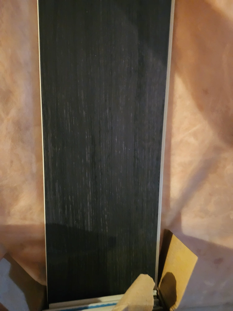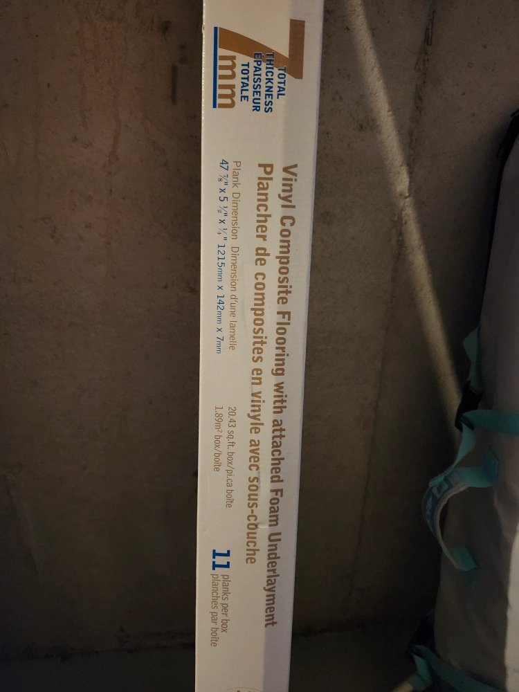 90Selling vinyl composite flooring with attached foam underlayment. Total thickness is 7mm. Each plank is 47 7/8" x 5 5/8" x 1/4", which is 121.5mm x 142mm x 7mm. There are 11 planks per box, covering 20.43 sq ft or 1.89m².