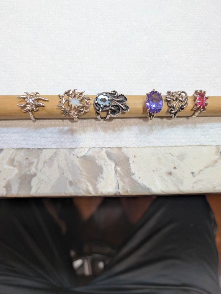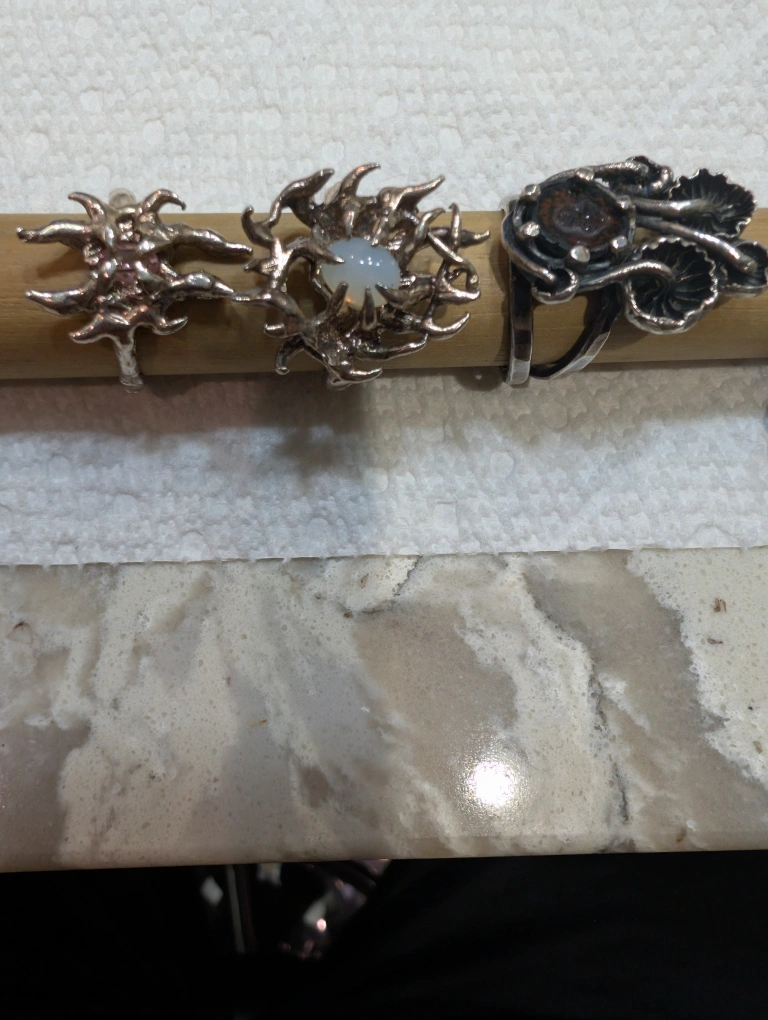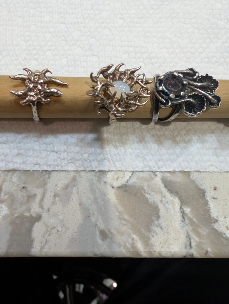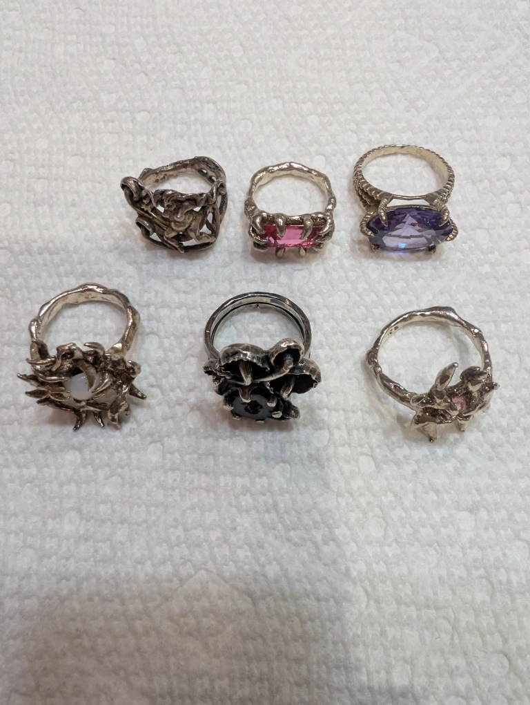 Selling a collection of assorted 6 Gothic silver color rings, each featuring unique designs and gemstones. The rings have a variety of styles, including floral and abstract patterns Gothic moonstone spiky ring, mushroom ring with a stone, Medusa ring .They are in good condition and ready to be worn!